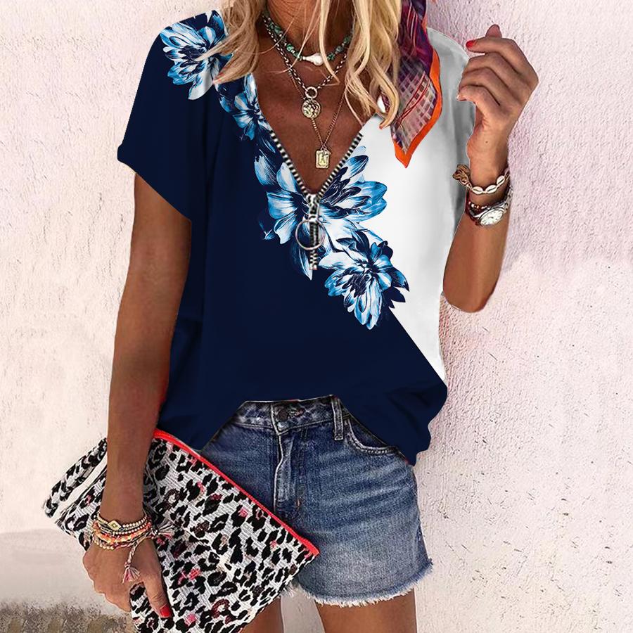 Женский топ, летний новый модный топ с розами и красивым цветочным принтом, повседневный топ на молнии с v-образным вырезом и короткими рукавами