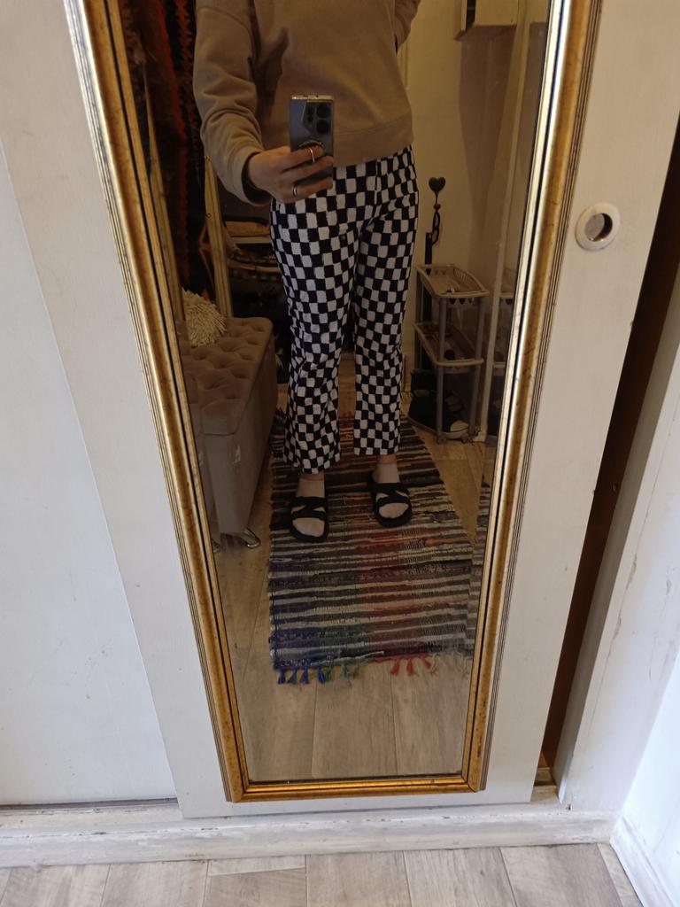 На рост 176 как брюки-кюлоты, и если сесть, попа торчит немного, печаль((( размер не совпадает, длина заявлена 104, а у меня 100