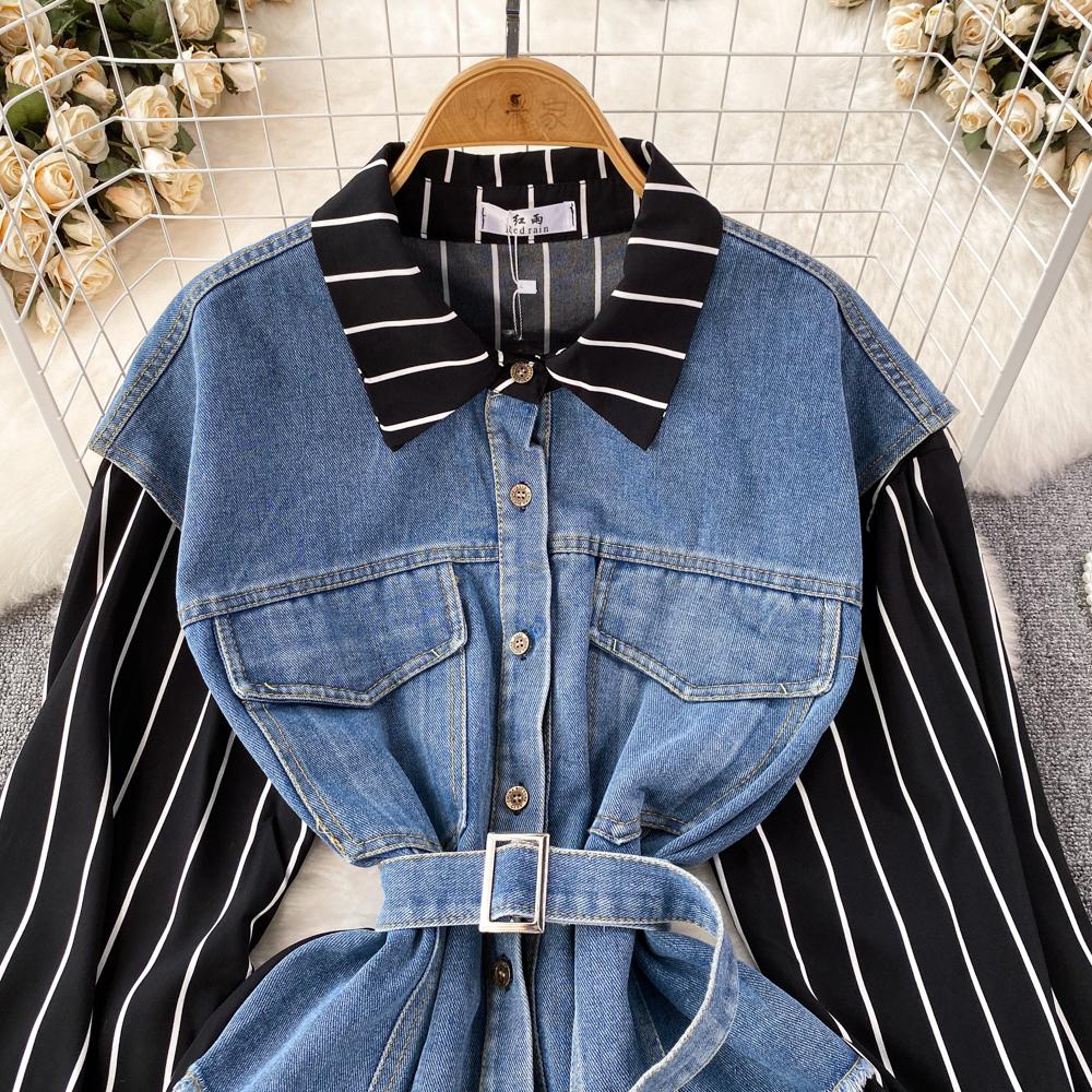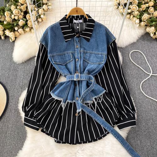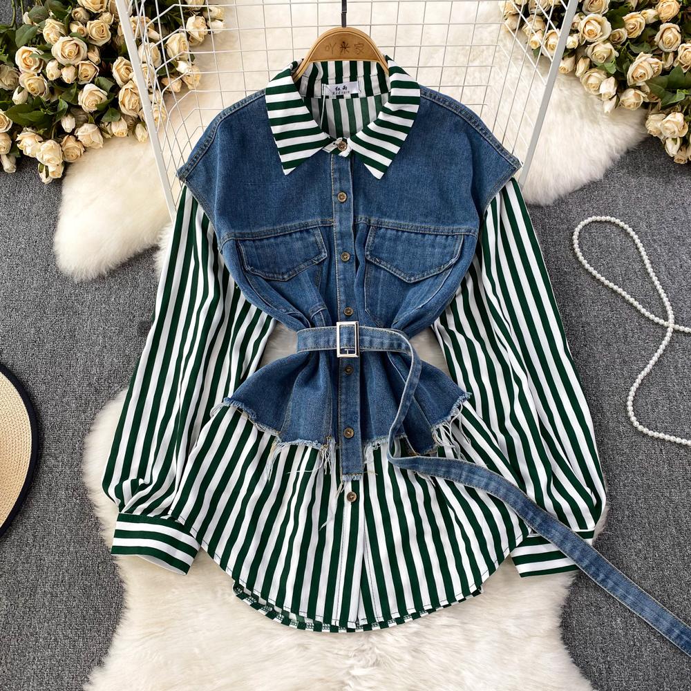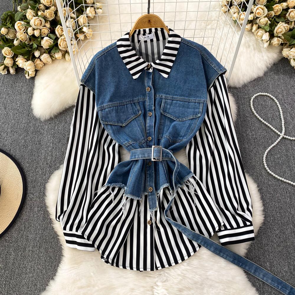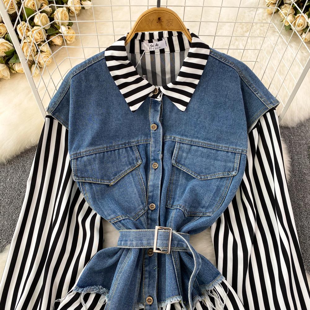 Весенне-осенняя Корейская Ретро Поддельная Два Свободных Джинсовых Жилета Полосатая Рубашка Женская Повседневная Нерегулярная Рубашка