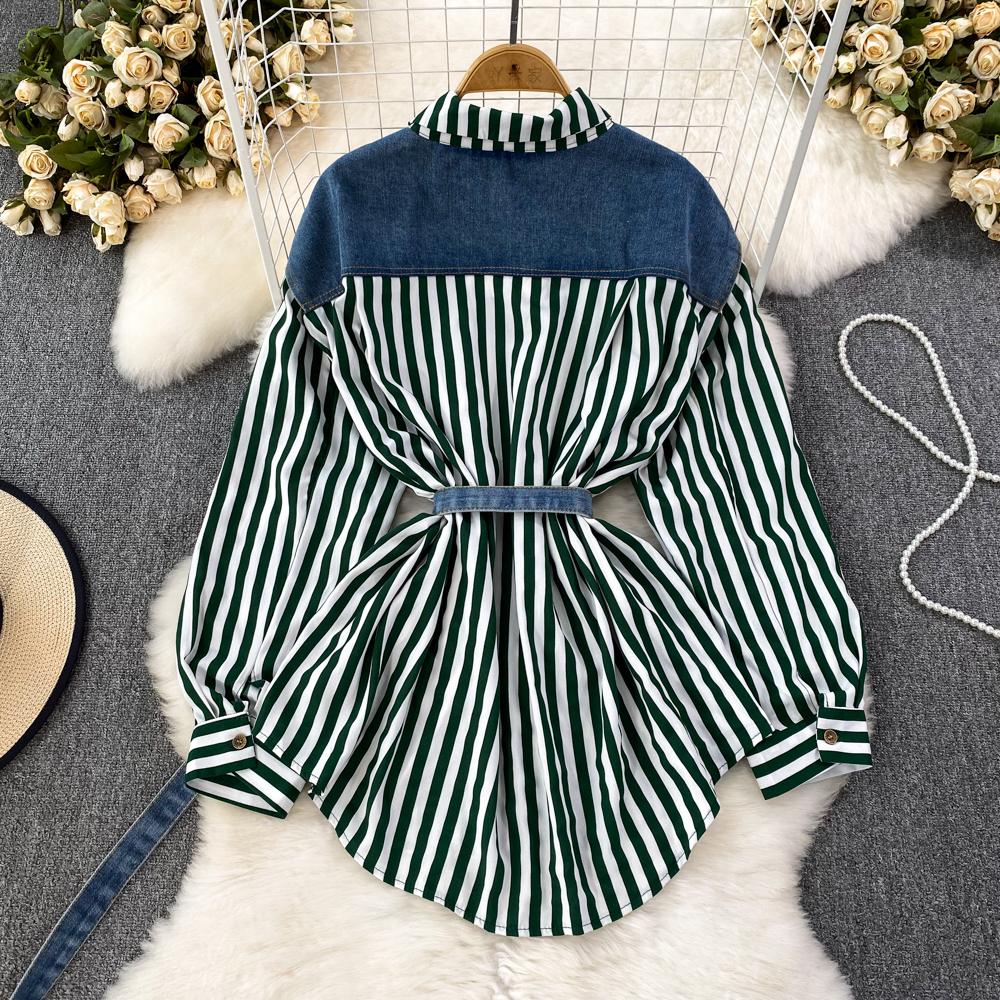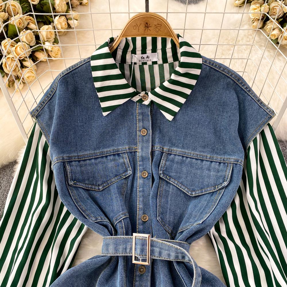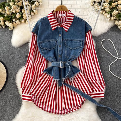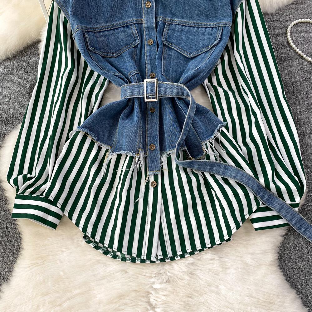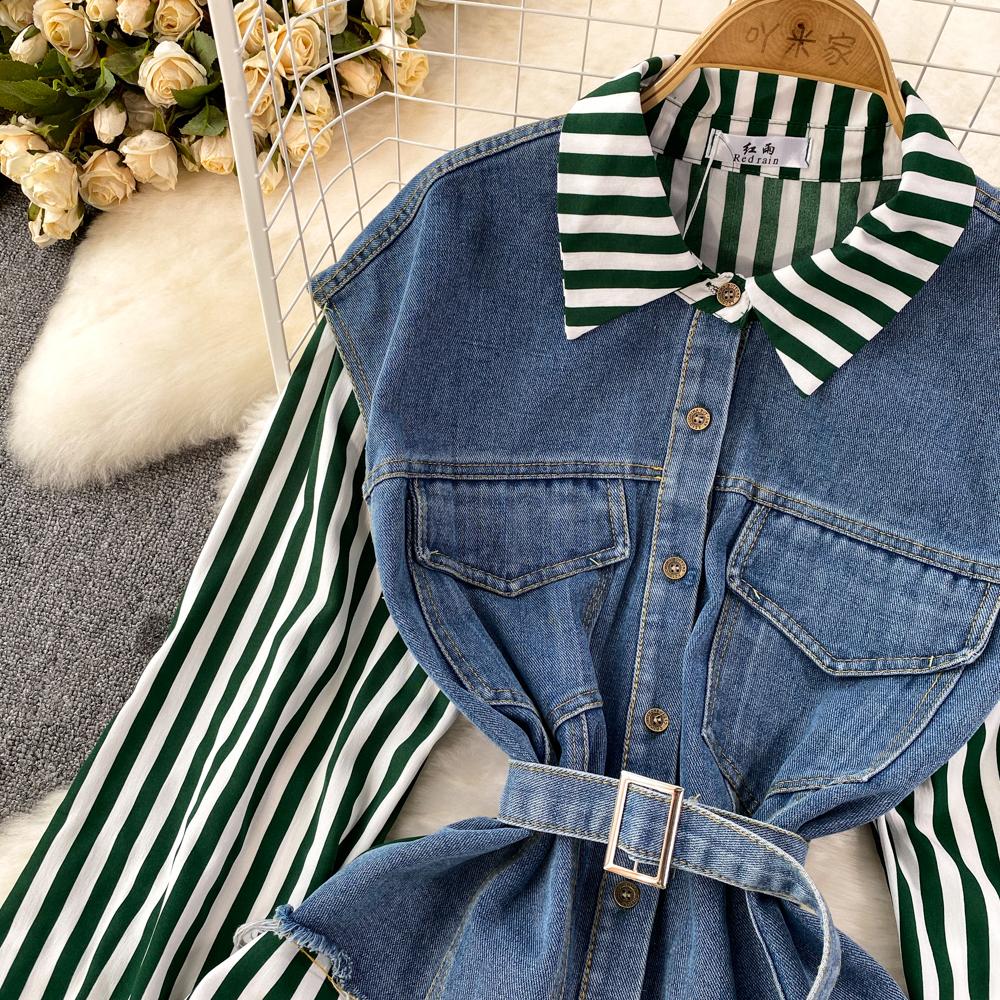 Весенне-осенняя Корейская Ретро Поддельная Два Свободных Джинсовых Жилета Полосатая Рубашка Женская Повседневная Нерегулярная Рубашка