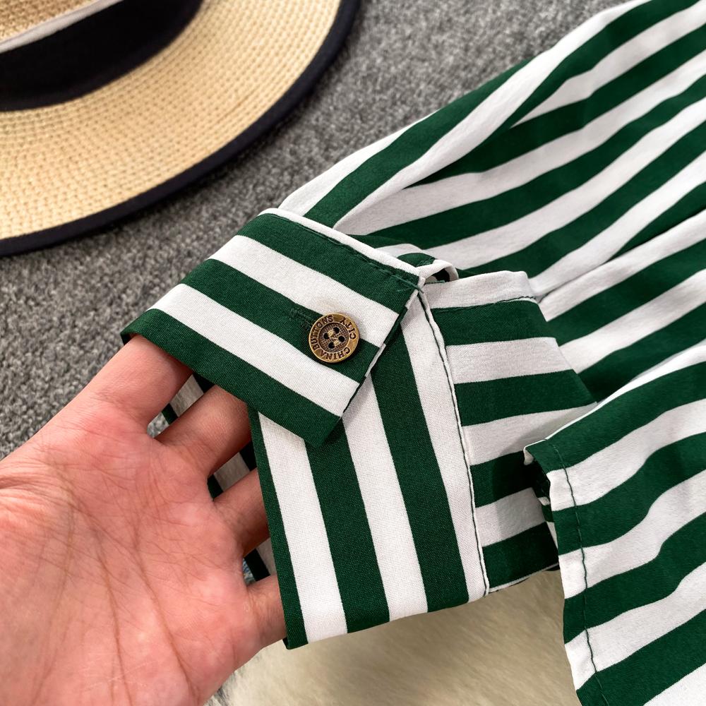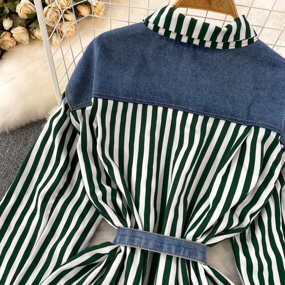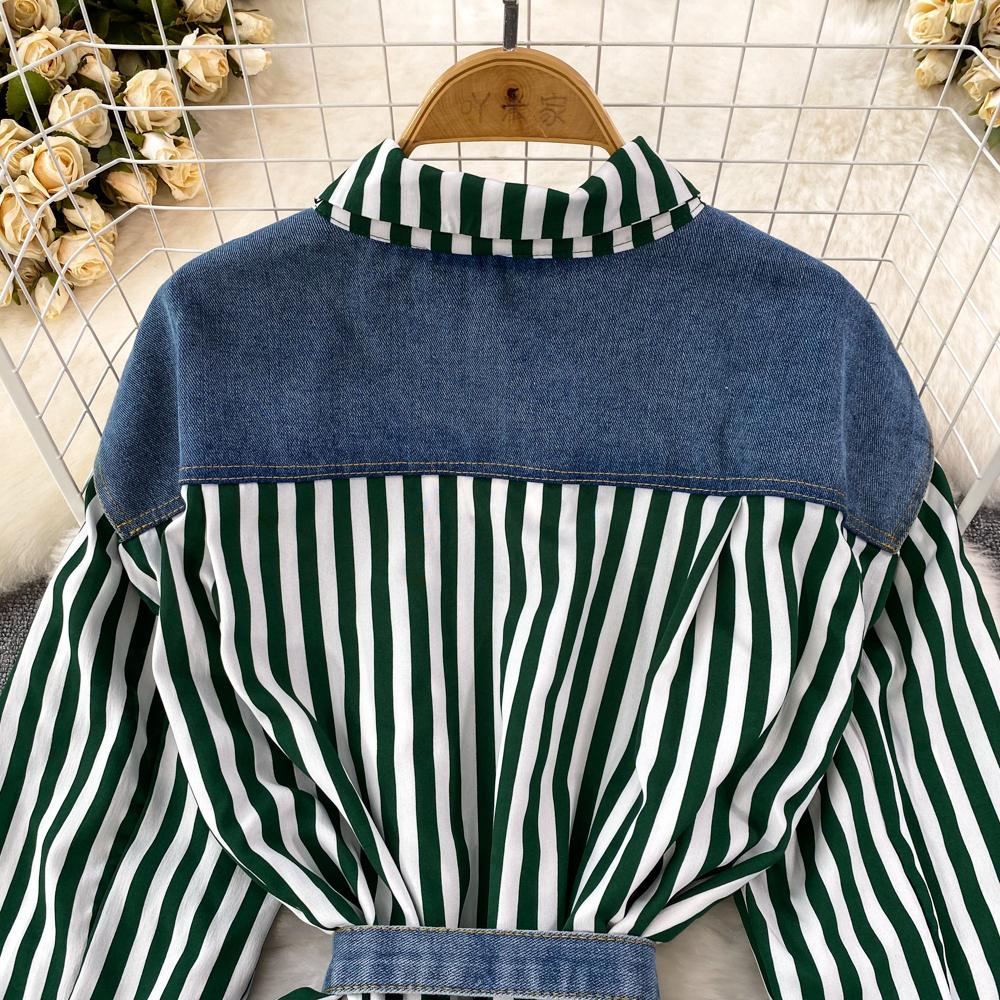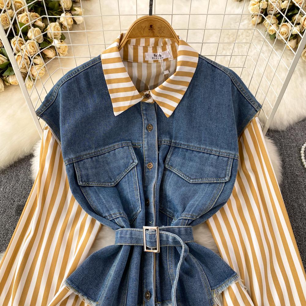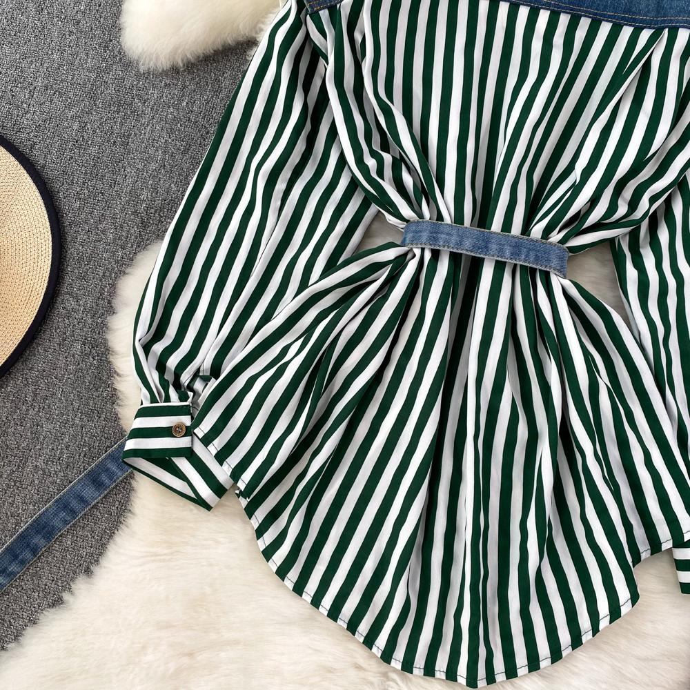 Весенне-осенняя Корейская Ретро Поддельная Два Свободных Джинсовых Жилета Полосатая Рубашка Женская Повседневная Нерегулярная Рубашка