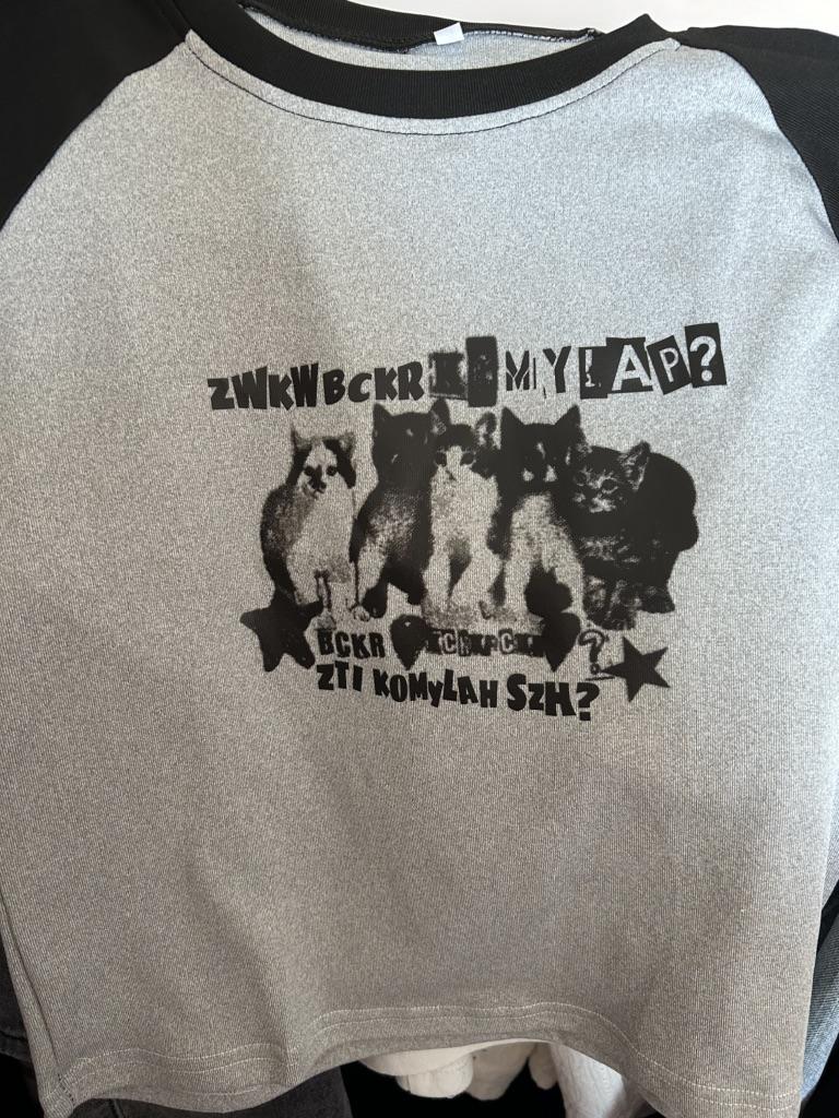 ну как бы внимание на разницу принта с фото на карточке товара и того, что пришло по факту 🥲 чернющие коты и непонятные надписи 🤡