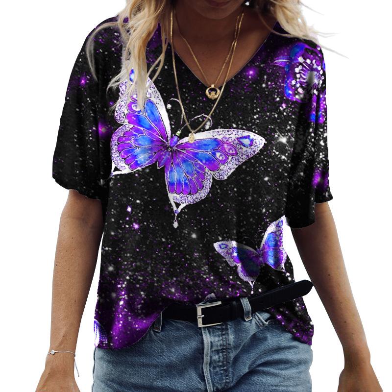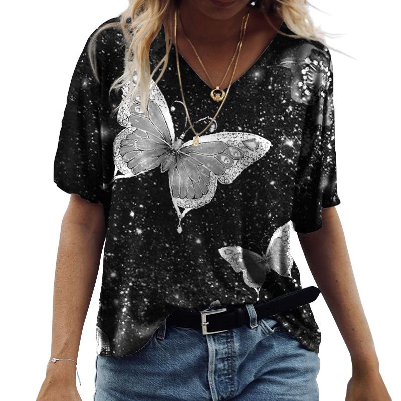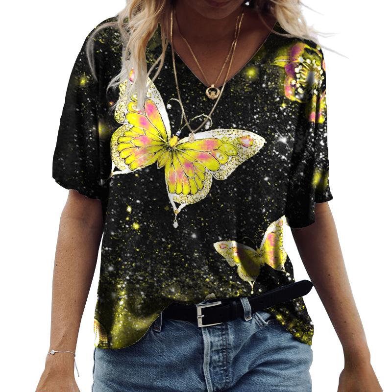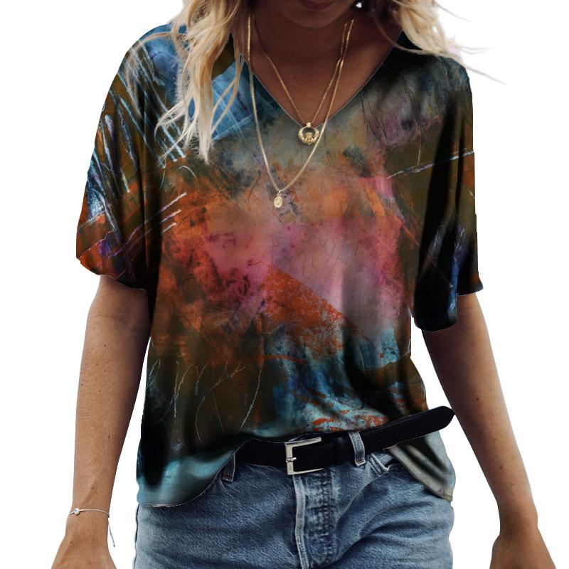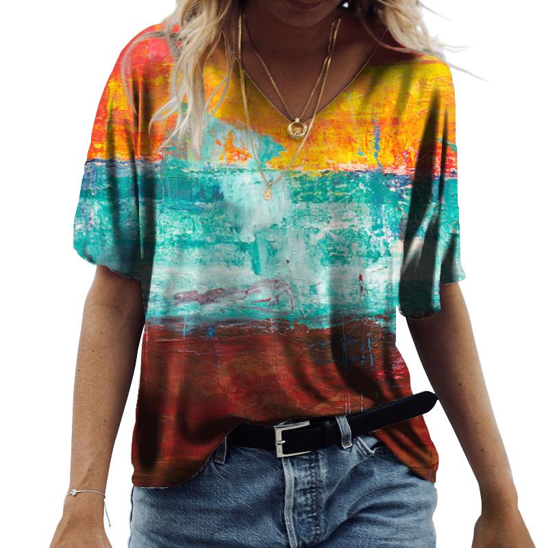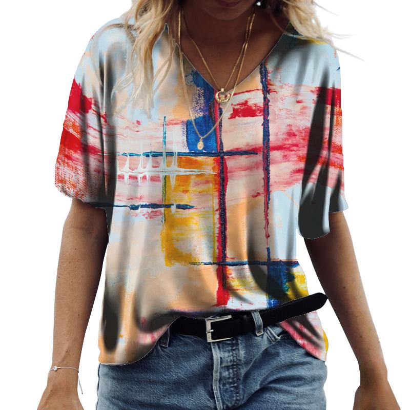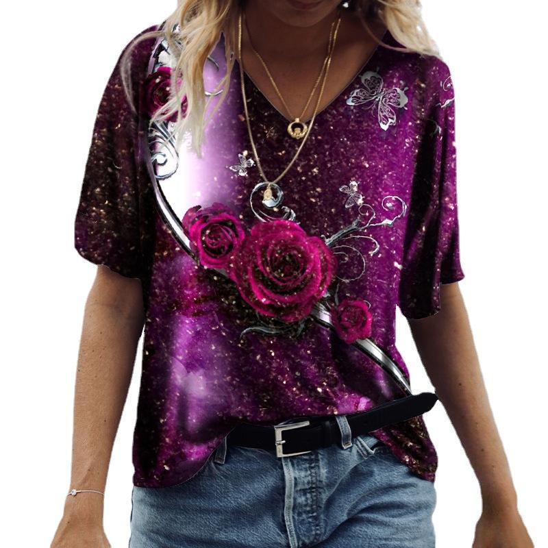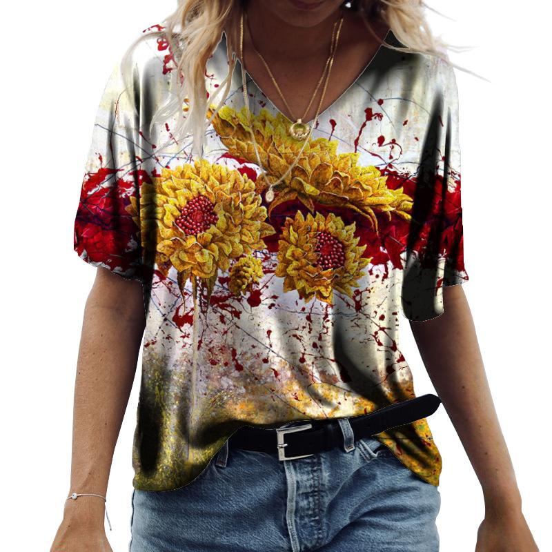 Летняя женская свободная 3D футболка с V-образным вырезом и коротким рукавом с цветочным принтом