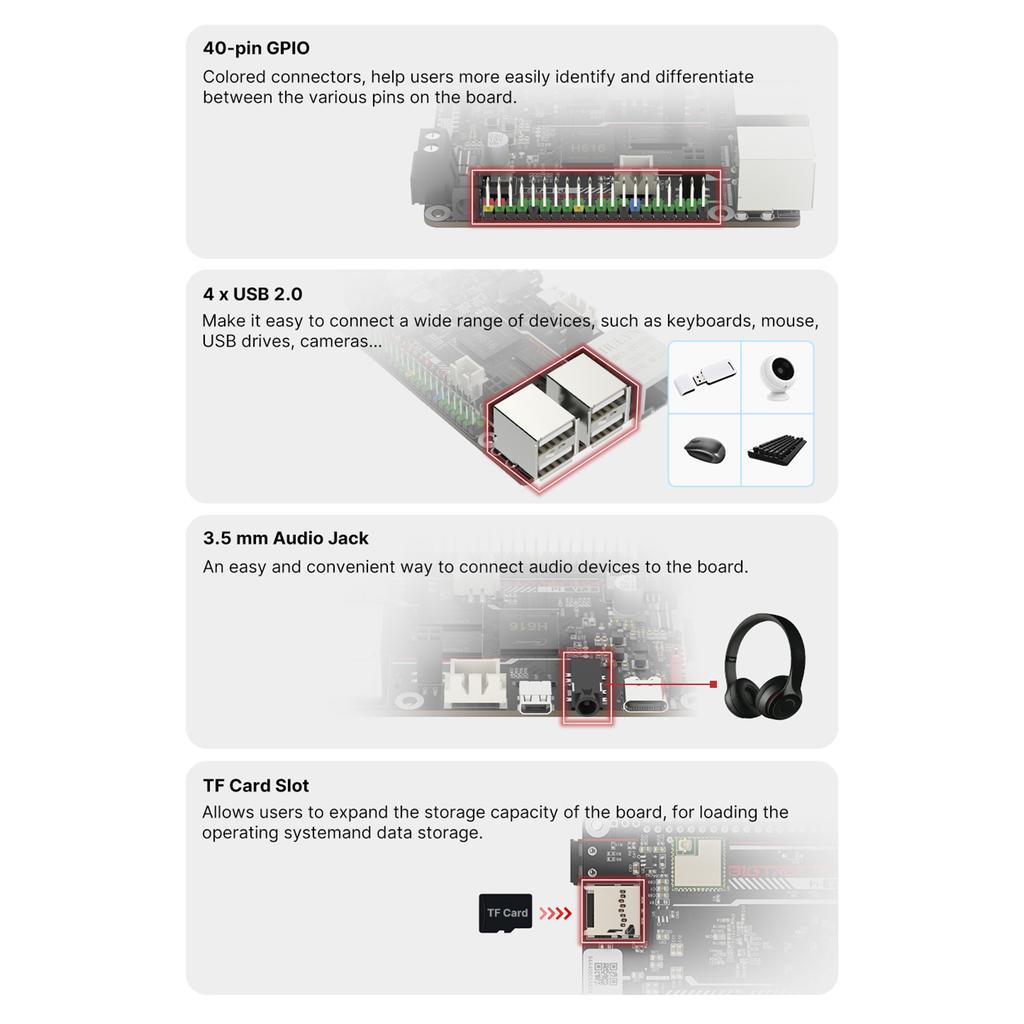 Этот продукт имеет несколько интерфейсов и функций, включая 4-полосные порты USB2.0, 40-контактный интерфейс GPIO, интерфейс акселерометра, зарезервированный интерфейс USB-CAN, встроенную инфракрасную головку приемника и т. Д. Эти интерфейсы и функции могут позволить пользователям применять и расширять более разнообразные приложения в различных сценариях, тем самым повышая гибкость и практичность продукта.