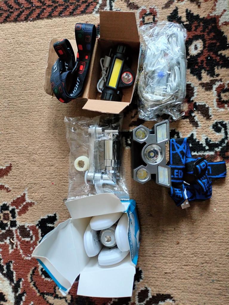 Получил сегодня. Упаковано. Вроде все цело. Налобные фонарики горят во все режимах,есть зарядные шнуровки. Смеситель,занавеску-дождик и светодиодную лампу раскладушку ещё не проверял.