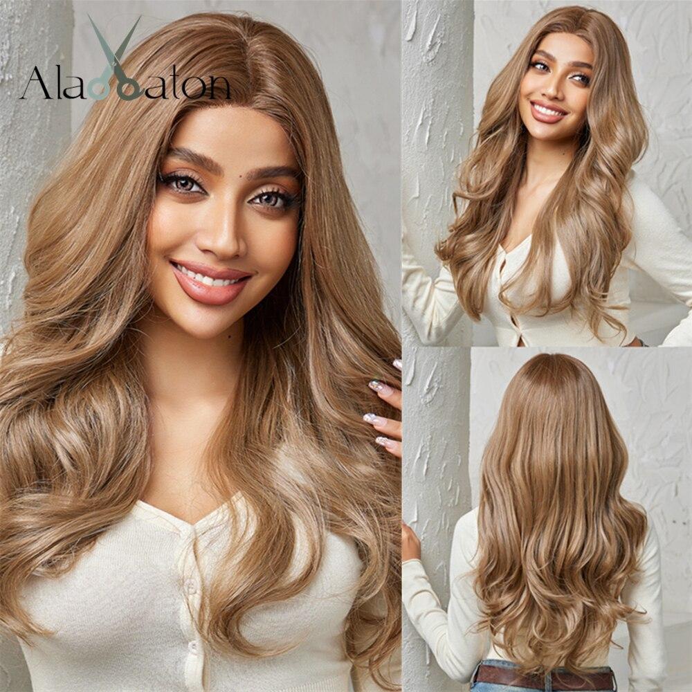 ALAN EATON Светло-коричневый парик спереди, длинные вьющиеся волны, парик со средним пробором, естественная линия волос, синтетические волосы для женщин, термостойкие