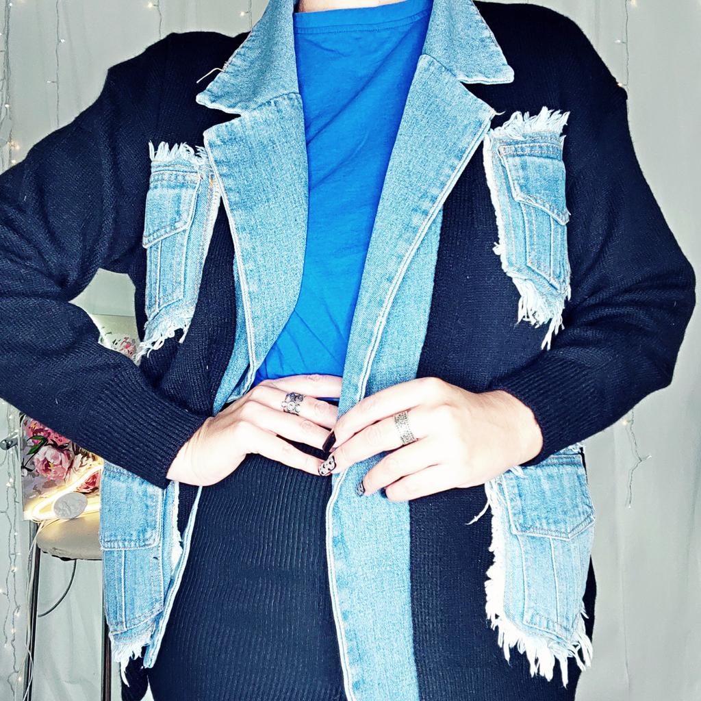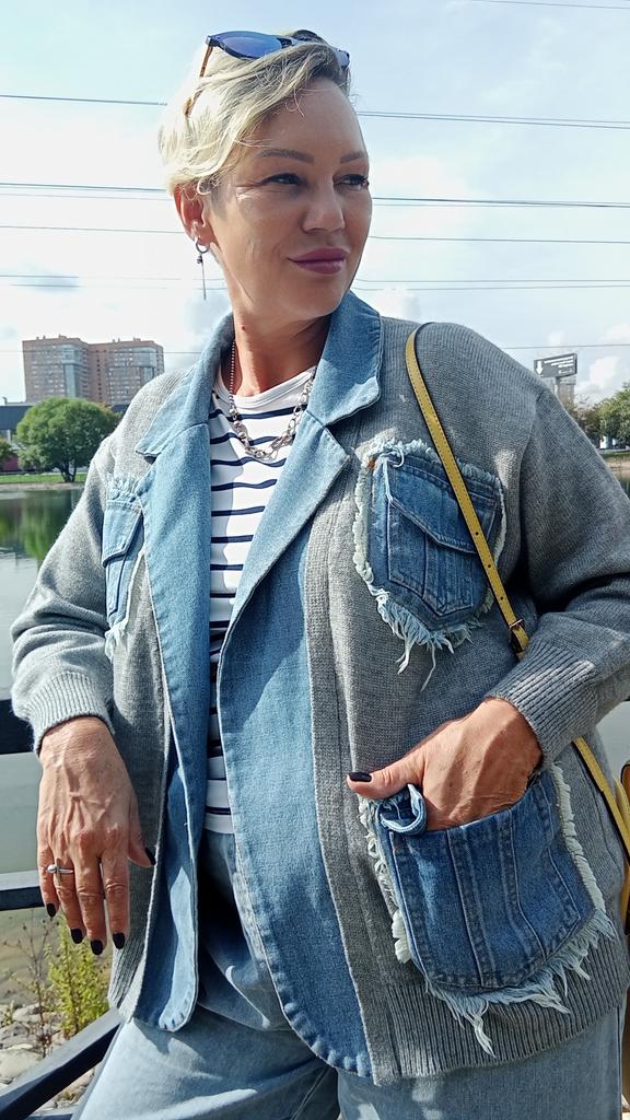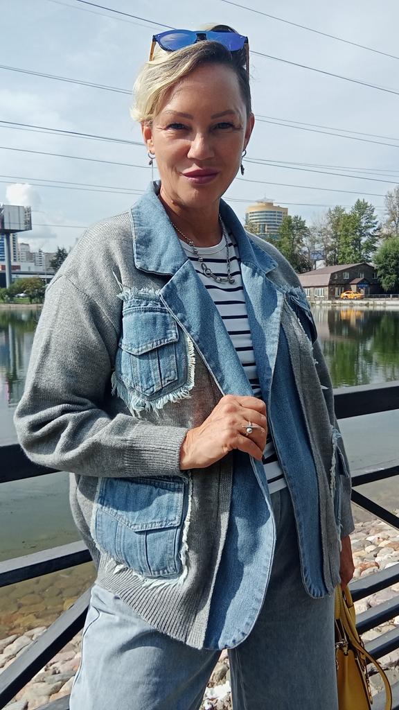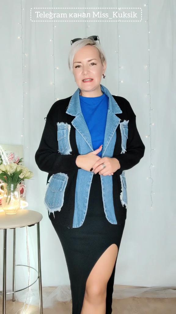 Джинсово- трикотажный пиджак. Больше обзоров, промокоды, подарки в моем телеграм канале. Жми лупу 🧐🔎, пиши @Наталья_Великая . Если не можешь найти, в любом поисковике: Яндекс, Гугл вводи: телеграм Наталья Великая . Все ссылки на товары из обзора ищи в моем телеграм канале. Ух, до чего хороша осенняя коллекция Диманаф! Что ни вещь, то шедевр! Наверное, мы все любим джинсу, а в сочетании с трикотажем она получает новое прочтение. Более современное , что-ли, даже элегантное. К тому же, трикотаж хорошо тянется, и чувствуешь себя в такой одежде гораздо комфортнее, чем если бы пиджак был полностью джинсовый. Опять-таки, накладные карманы с рваниной по краям, делают образ дерзким и модным. Мои параметры :рост 167, 100-87-102. Пиджак идёт в едином размере. Цвет есть ещё чёрный. Замеры: Плечи 54 ОГ 120 Пройма 44 Длина рукава 49 Длина 65.
