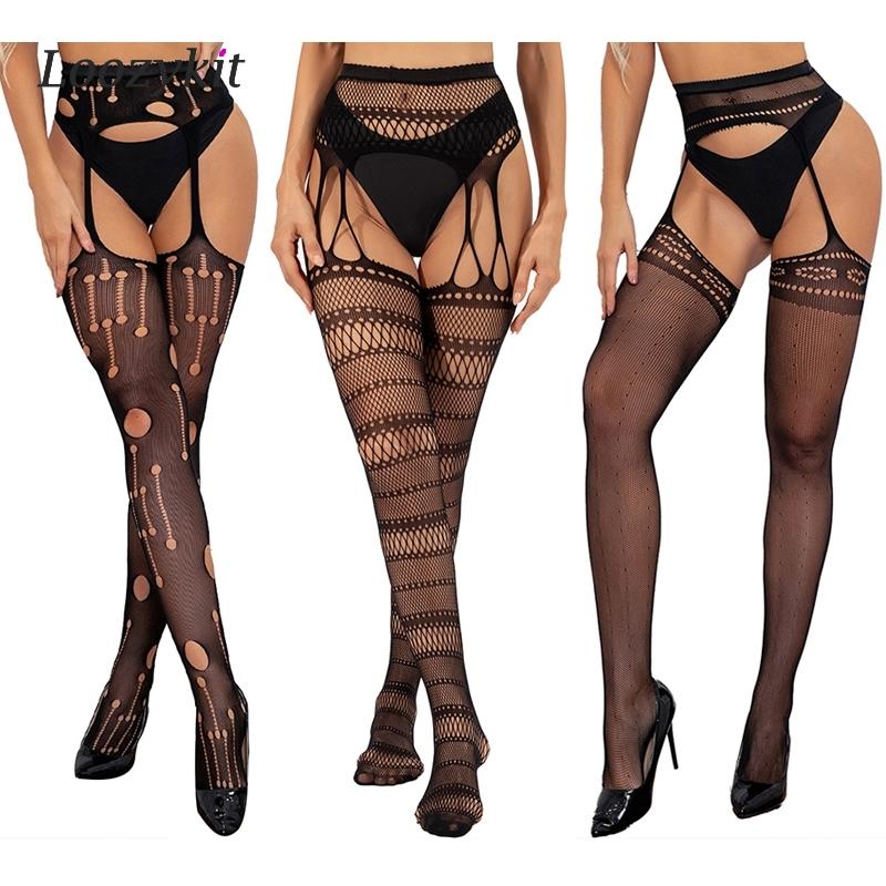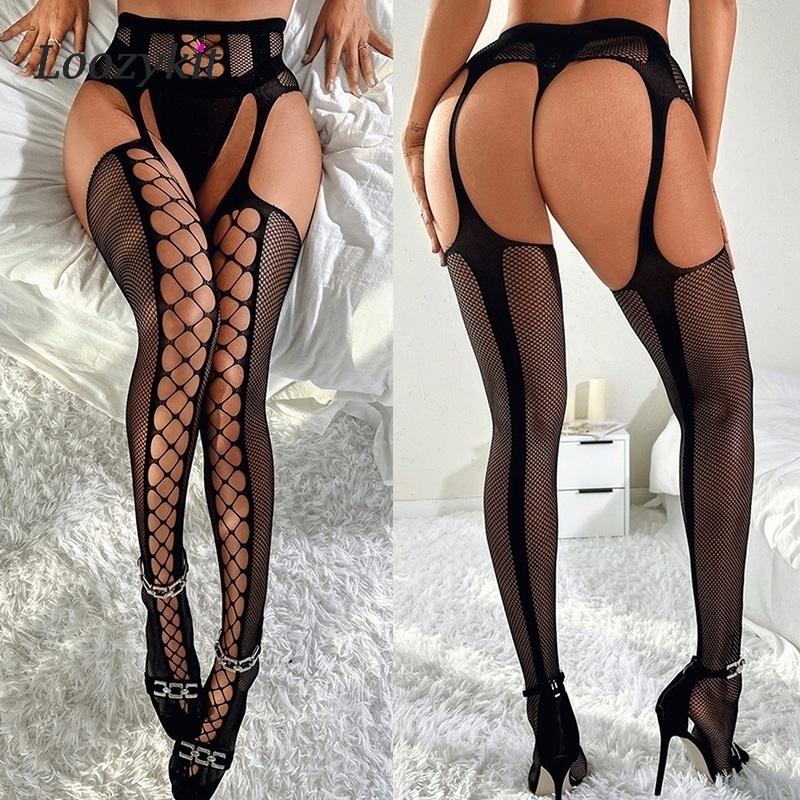 Сексуальные ажурные чулки для секса, сетчатое прозрачное нижнее белье, женские нейлоновые чулки до бедра с подвязками и открытой промежностью