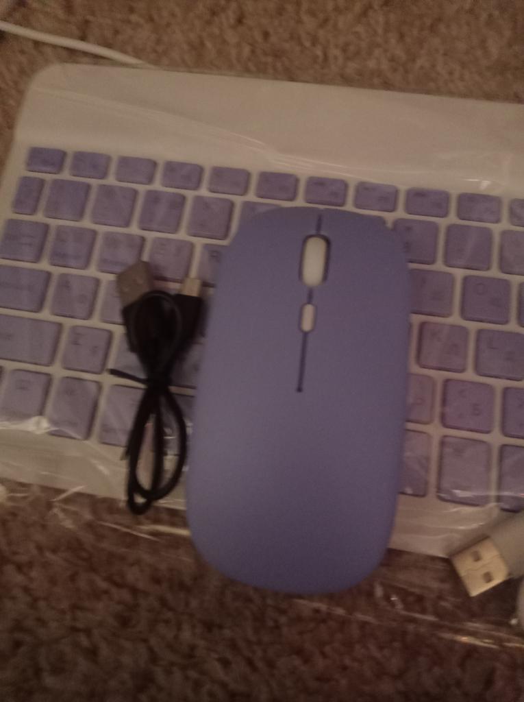 Здравствуйте Друзья!спешу, Поделиться, с вами отзывом о товаре пришедшим 11.11.23. На фото видно пупырку обмотанную скотчем. На видео видно. Какая она огромная. Я, честно вам скажу. Я еле ее открыла. Замотали блин пипец. 😅 правда еще не подкл. Так что допишу ещё если что Вообщем. Цвет, клавиатуры по заявленному. Фиолетовый. На вид всё ок. Ну, а в деле... Поживём, увидим! Дополняю отзыв. Мышка и клавиатура сосваей работой, справляются, исправно Ура а-а-а-а-а! 👍 Спасибо, Джум, и продавцу. Товар, к покупке рекомендую!