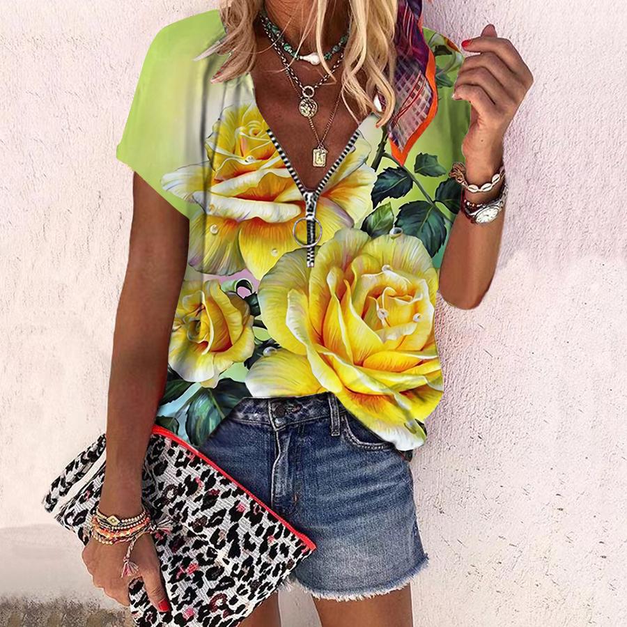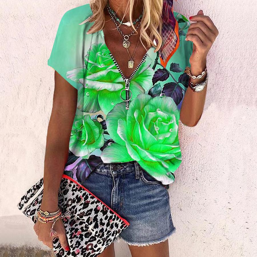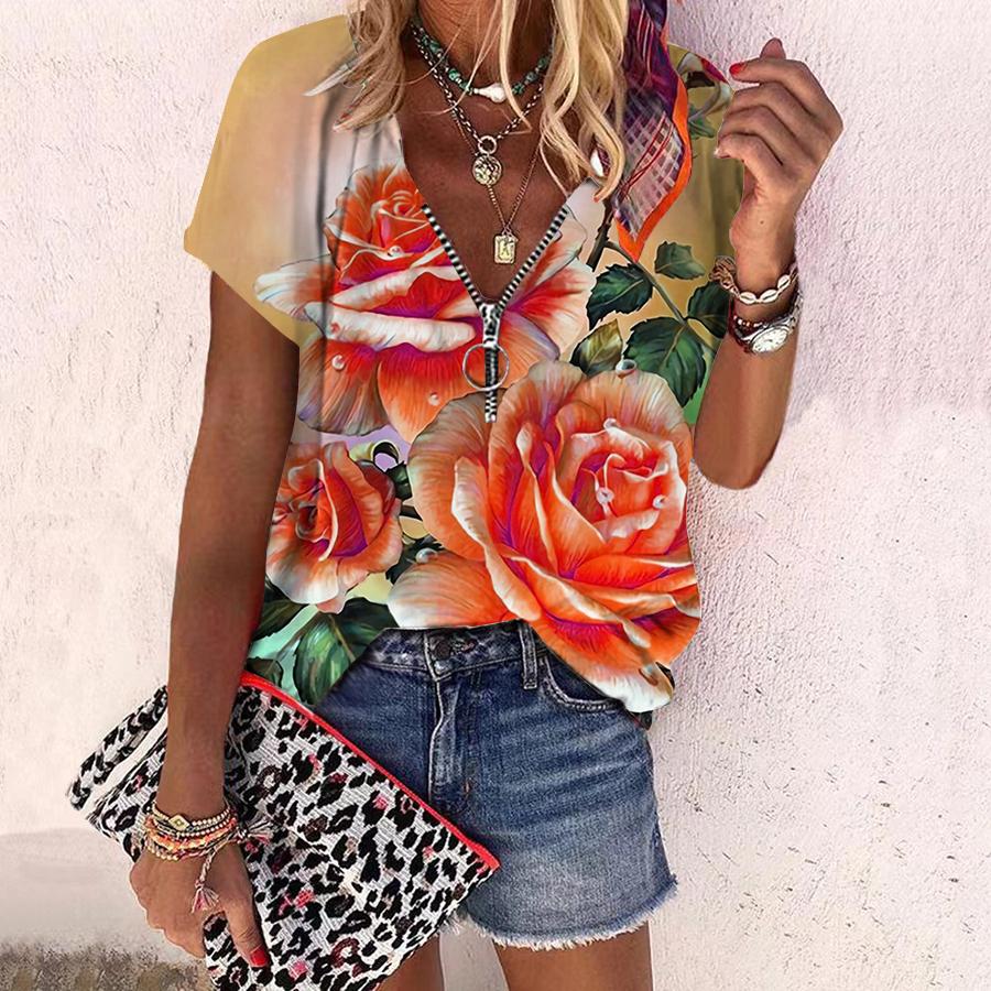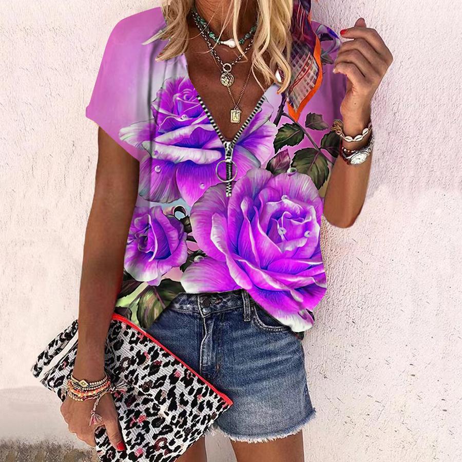 Женский топ, летний новый модный топ с цветком розы, повседневный топ с короткими рукавами и застежкой-молнией с v-образным вырезом и ярким розовым принтом