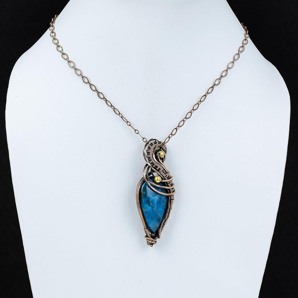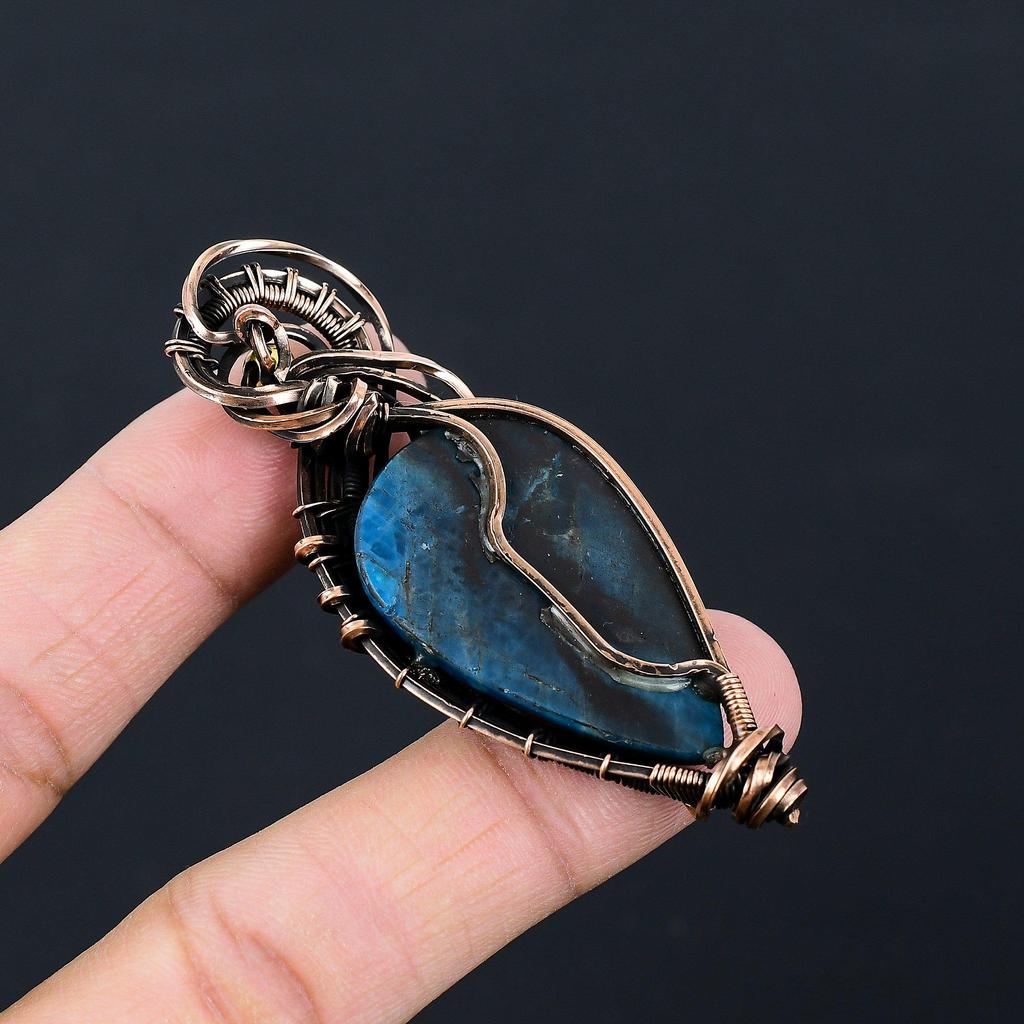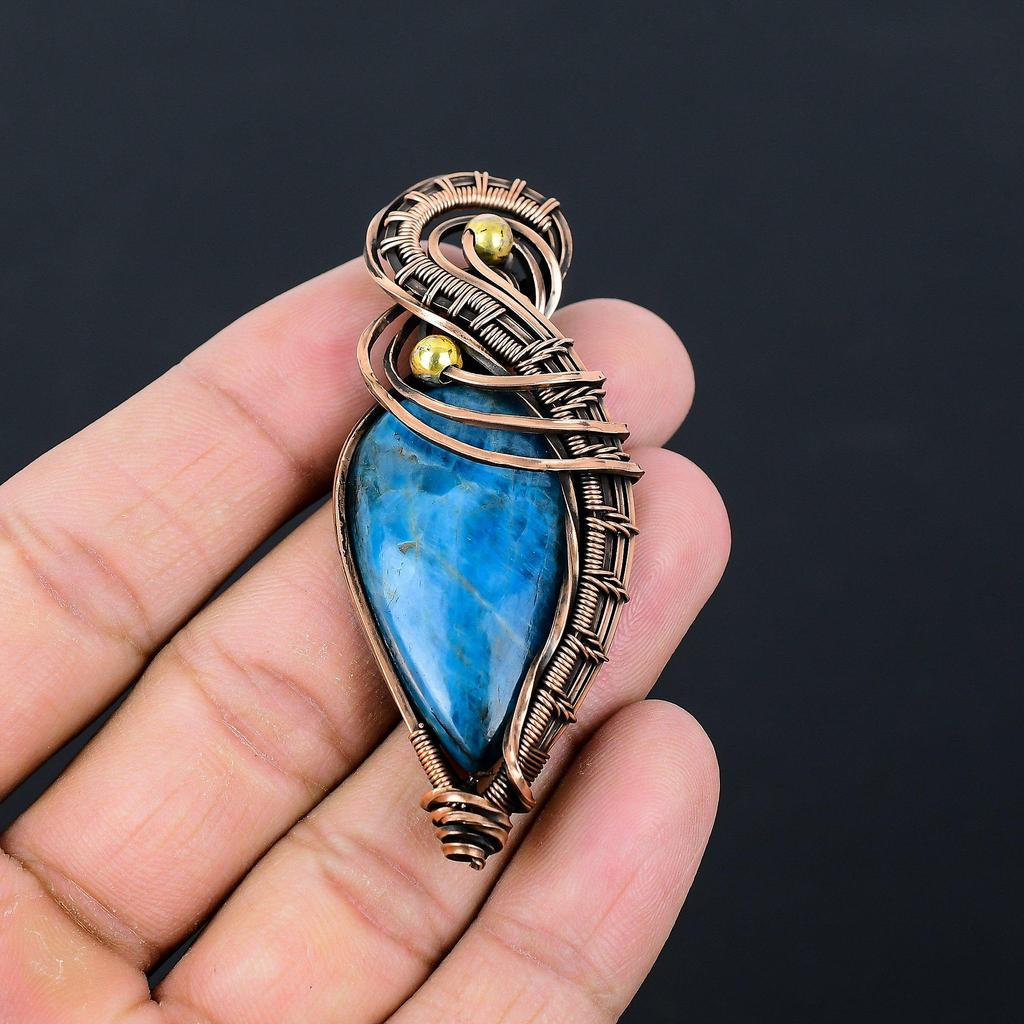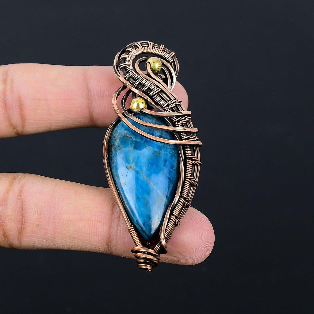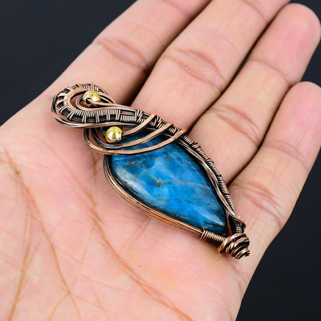 Привлекательный неоновый синий апатитовый драгоценный камень Чистая медная проволока, обернутая ювелирным кулоном ручной работы