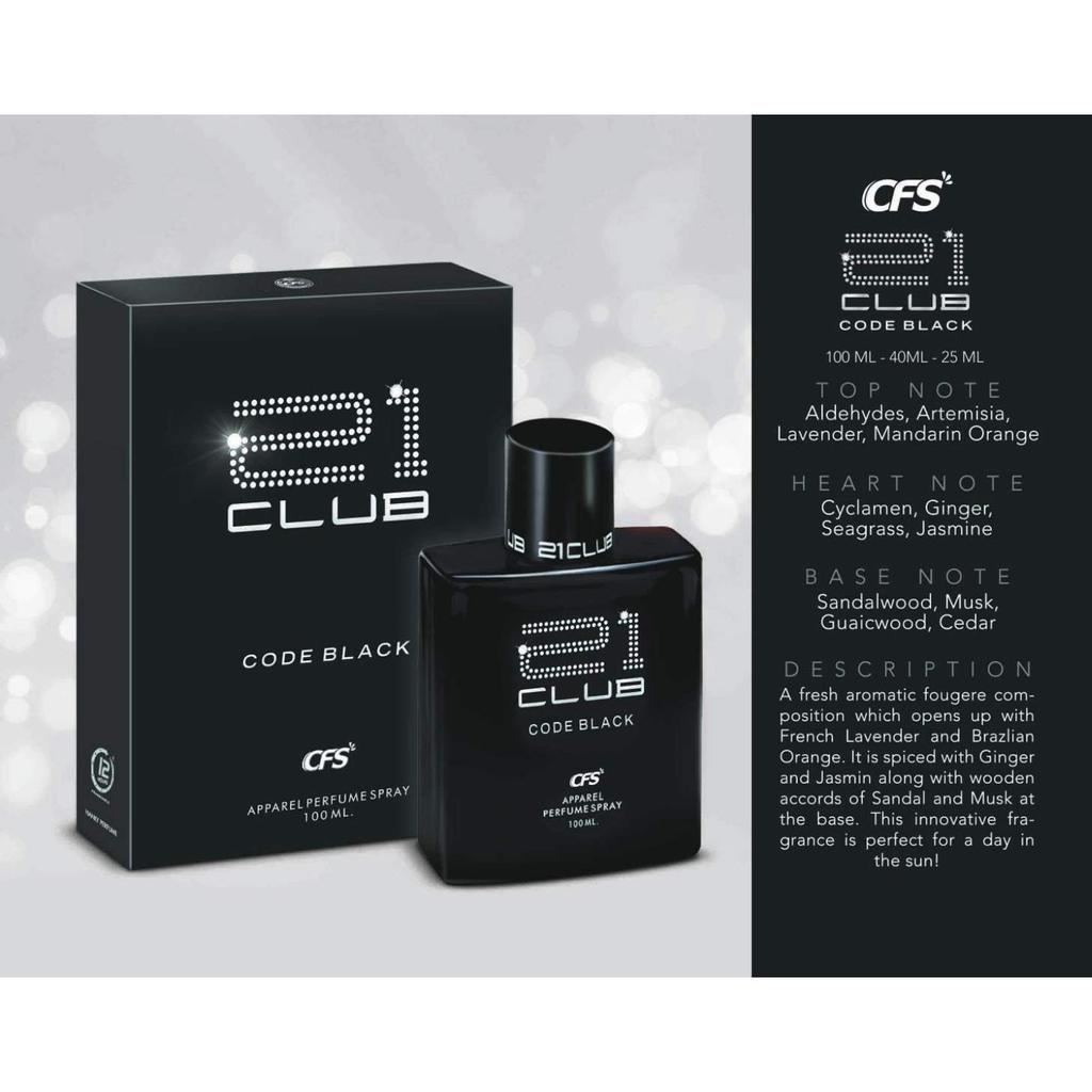 21 Клубный код Черный : Свежая ароматическая фужерная композиция, открывающаяся нотами французской лаванды и бразильского апельсина.. Он приправлен имбирем и жасмином вместе с деревянными аккордами сандала и мускуса в базе.. Этот инновационный аромат идеально подходит для дня на солнце!