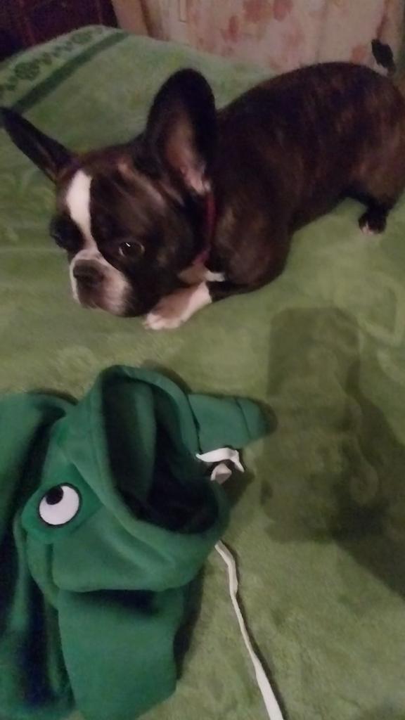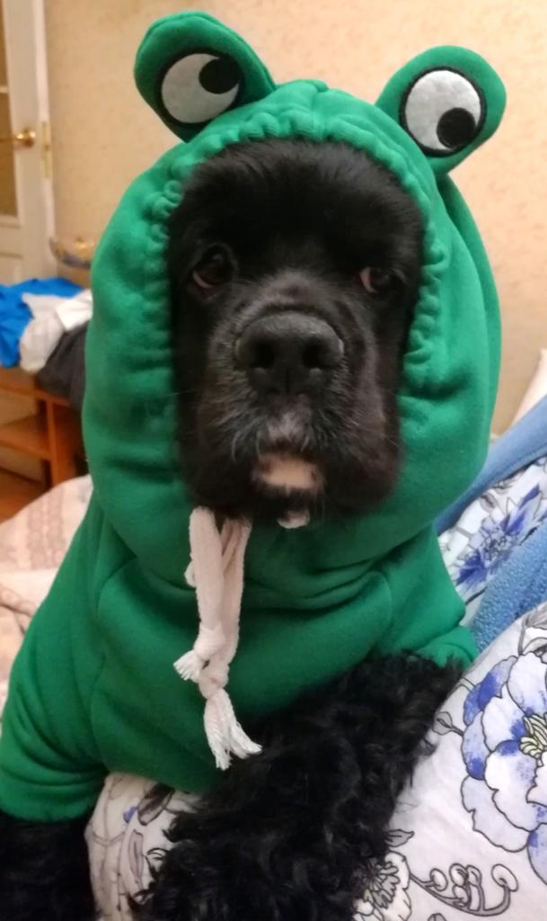 Очень милая кофта. Прикольная лягушка. Качественный пошив. Боялась, что мой кокер спаниель не влезет. Кофта тянется. Она влезла, но если бы был размер больше, то я бы купила. Но все равно мы очень довольны. Выглядит замечательно.