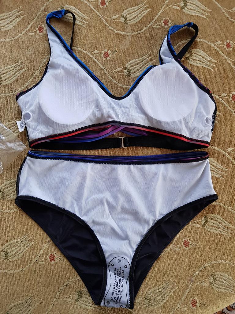 Чуть ошиблась с размером, в итоге верх немного большой. Внутри бюстика тонкие поролоновые вкладыши. Мне кажется, что больше подойдёт для небольшой не обвисшей груди, так как не держит вообще грудь. У меня размер В - более не менее. Сохнет быстро, но ткань тонкая и плохо тянется, так что надо попасть в размер, чтоб хорошо село. На загоревшем теле смотрится очень хорошо.