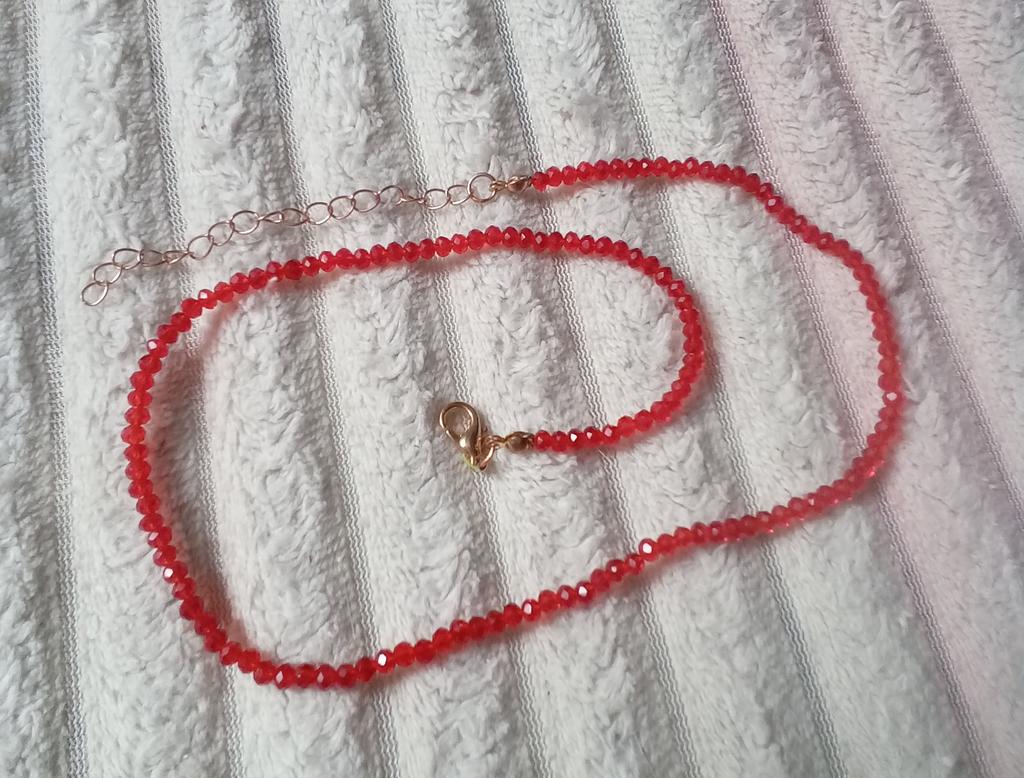 Бусы из прозрачного белого бисера. Всё не плохо. Но почему-то дополнительная цепочка для длинны изделия была прикреплена к другому концу бус,пришлось самой её перецеплять туда куда надо.И мне не понравилось,что цепочка и застёжка исполнена под золото. В чёрном варианте бусы мне прислали с застёжкой под серебро.