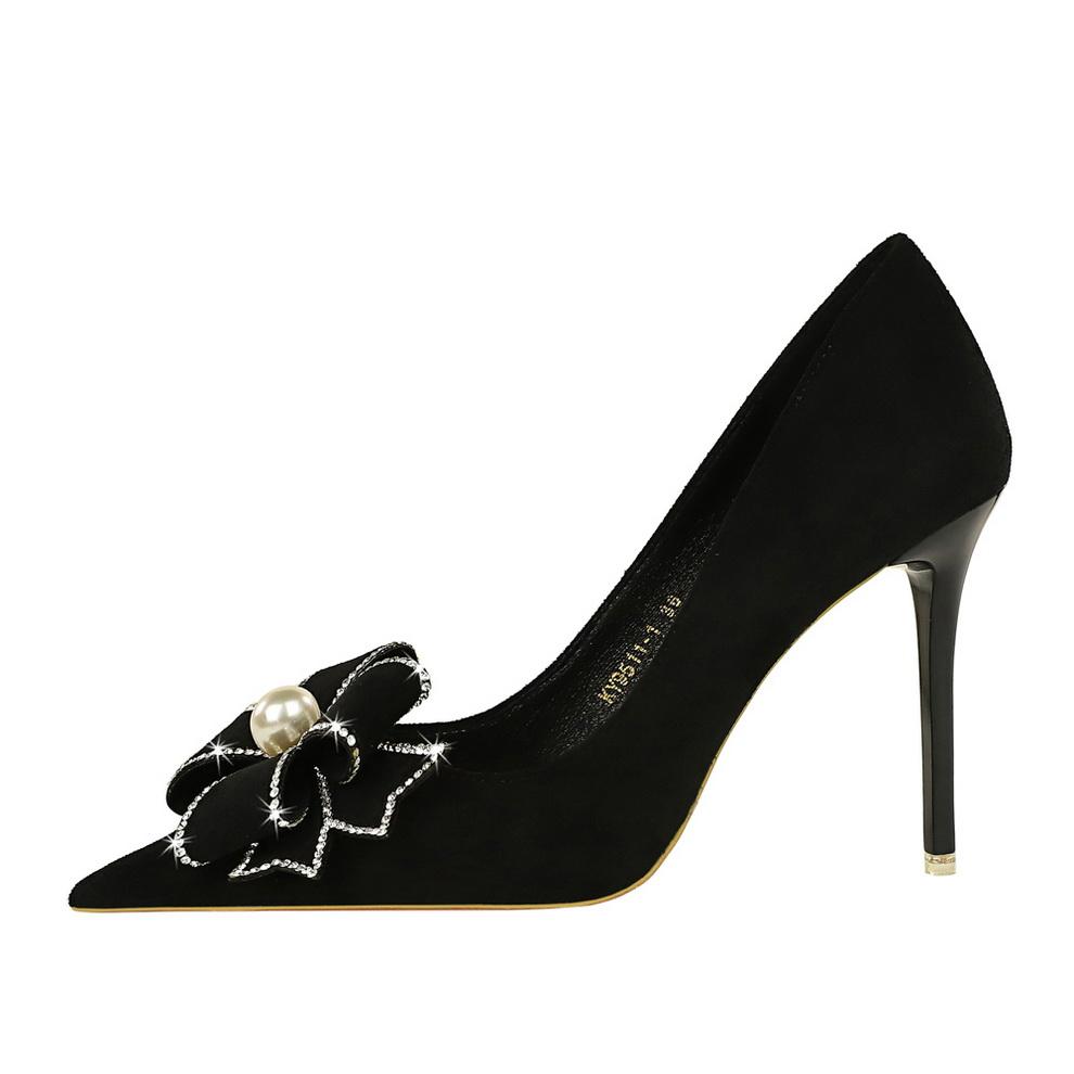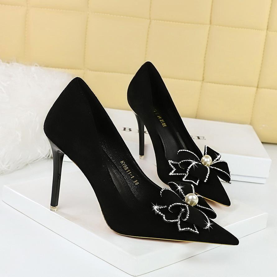 BIGTREE, женская обувь на высоком каблуке в европейском стиле, на очень высоком замшевом каблуке с острым носком и бриллиантами, с жемчужным бантом