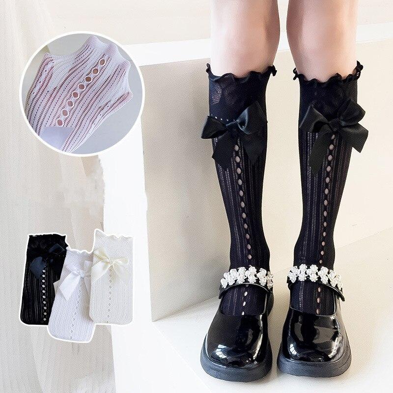 1 пара детских гольфов для девочек, летние тонкие дышащие носки до середины икры для маленьких девочек, кружевные полые носки с большим бантом для детей от 3 до 12 лет