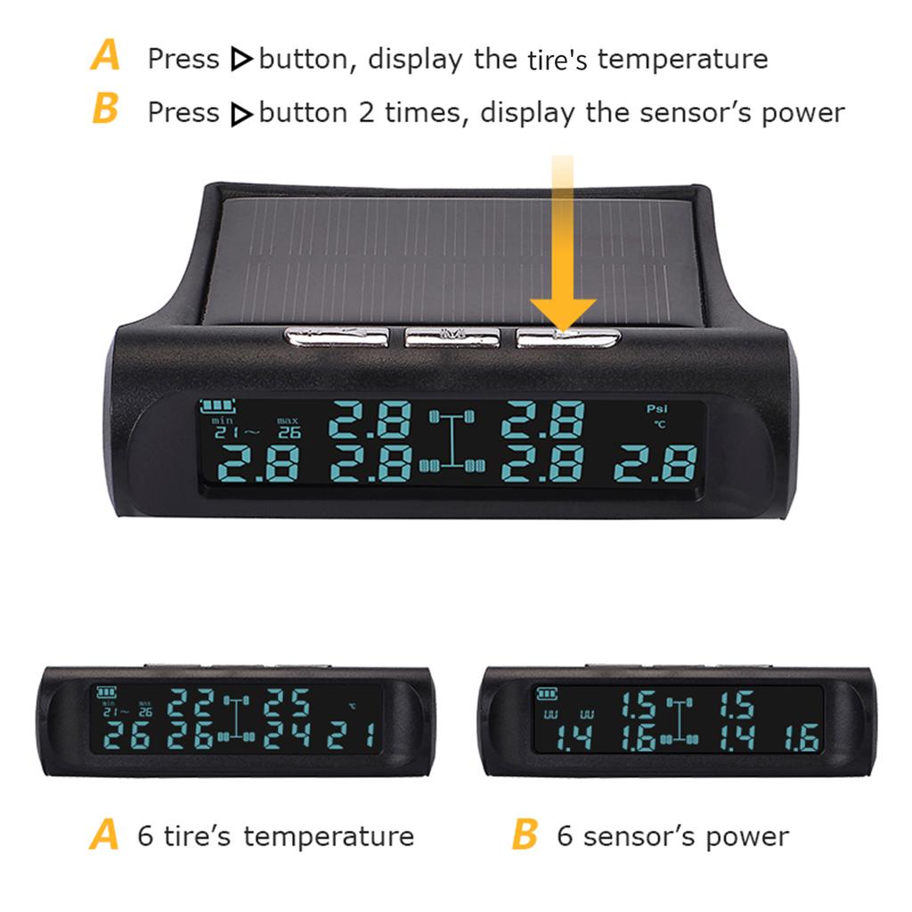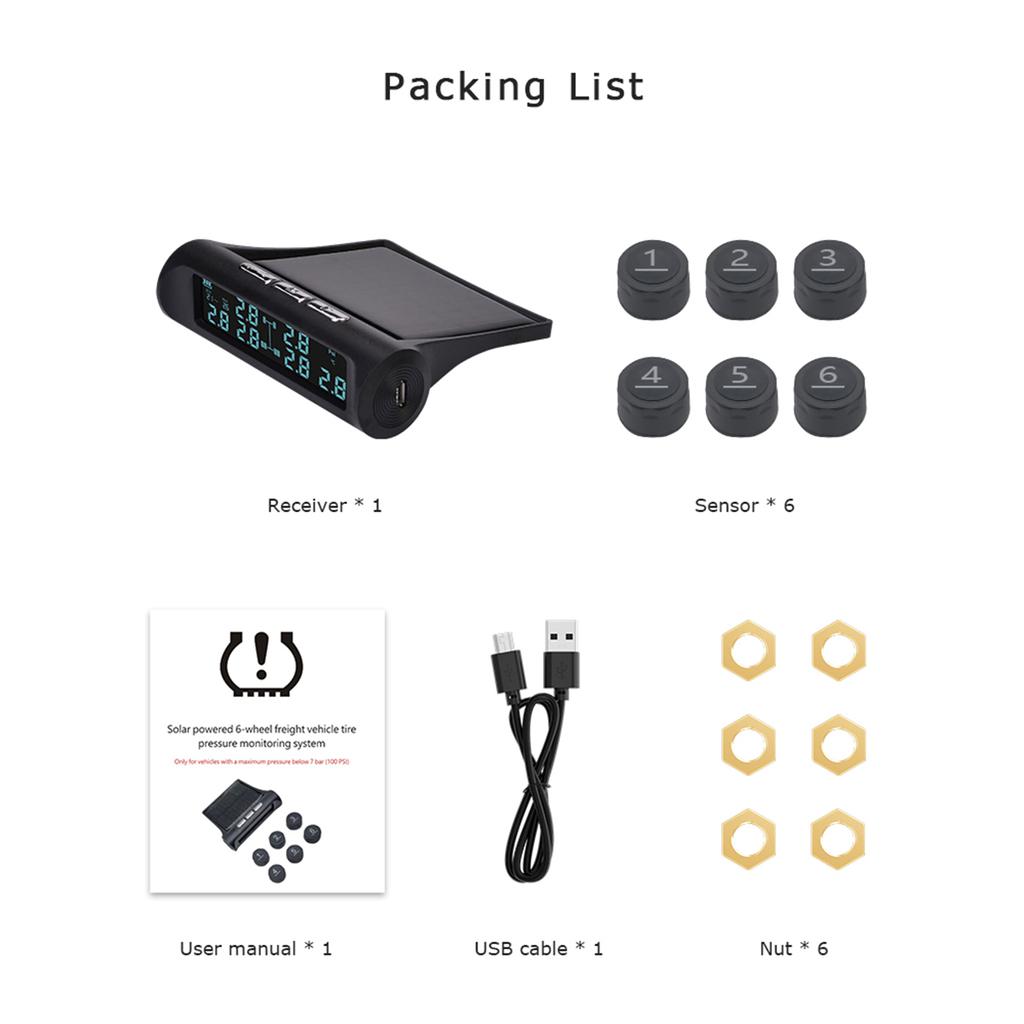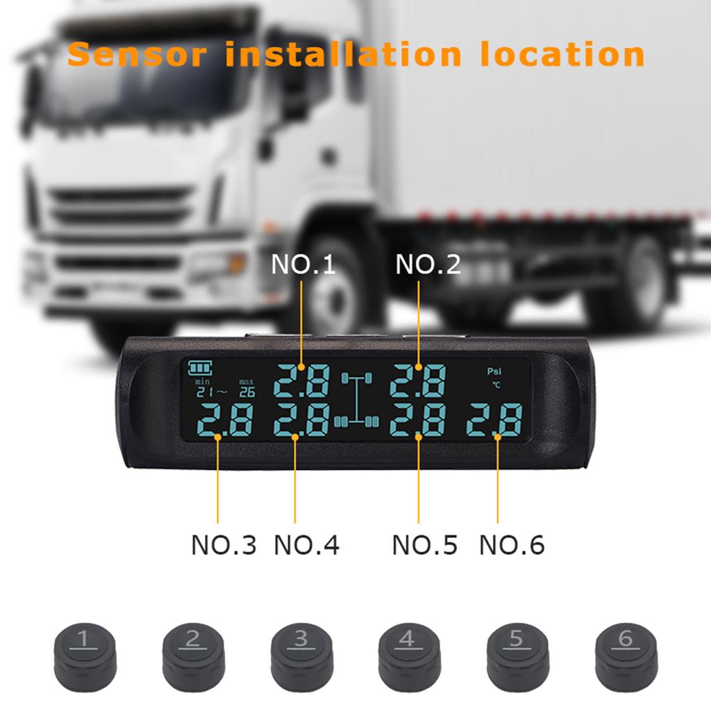 Солнечная и USB-зарядка: Система контроля давления в шинах 6-колесного грузового автомобиля может заряжаться как от солнечной батареи, так и от USB, что гарантирует, что она всегда готова к использованию.