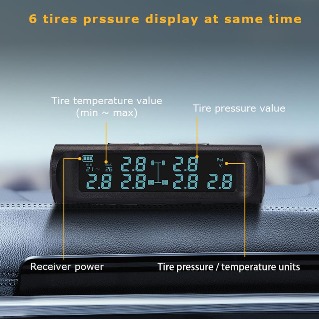 Мониторинг в режиме реального времени: Система контроля давления в шинах может отображать давление во всех 6 шинах одновременно, обеспечивая мониторинг в режиме реального времени и гарантируя, что водители всегда будут знать о давлении в шинах своего автомобиля, помогая водителям избегать аварий и повышая общую безопасность на дороге.