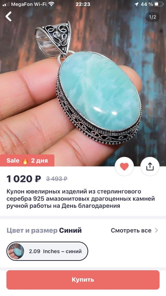 Кулон пришёл другого цвета. Заказывала синий( голубой) натуральный камень, а пришёл камень синтетический болотного цвета. На фото то что получила….