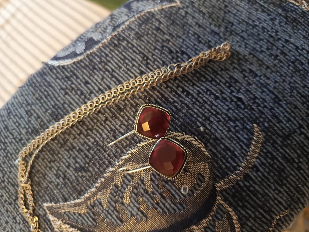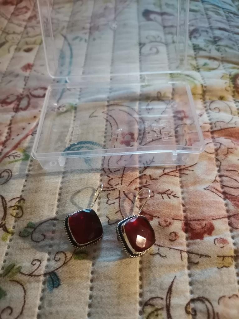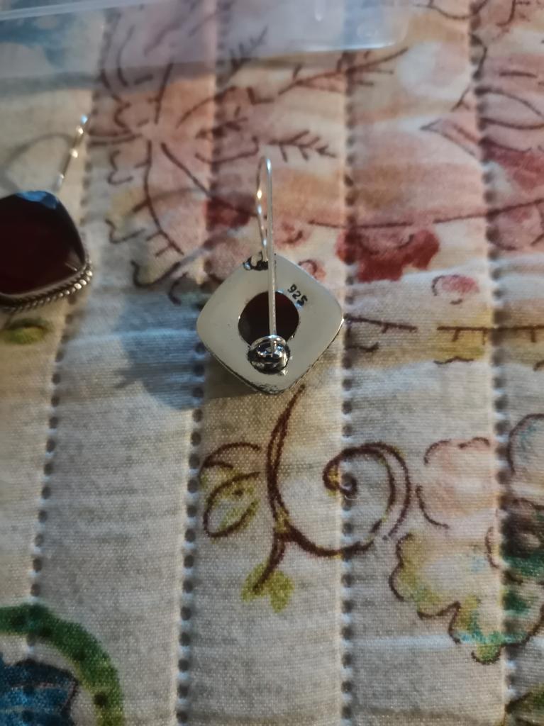 Получила Серьги, крупные в виде ромба, не знаю гранат это... Привыкла что гранат тёмный, а это размытый бледный, стоит проба, но сам металл хлипкий, мне кажется быстро погнется. Сами серьги стмпатичные крупные.