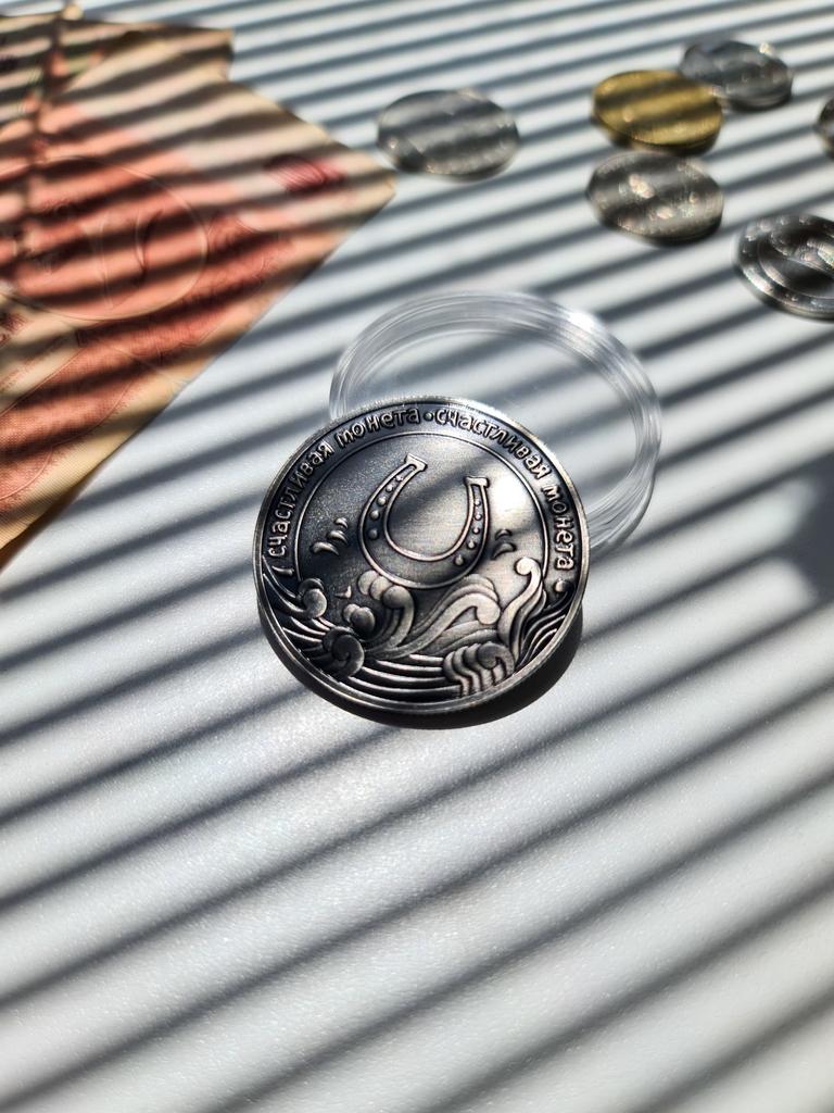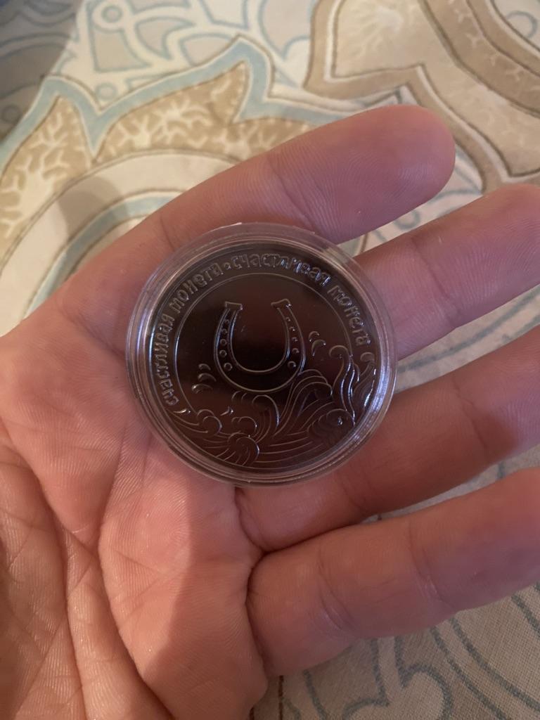 Счастливая монета 🪙 Заказала ее для сына, он в восторге 🤩 Монета отличного качества. С одной стороны изображён карп с надписью "Исполняю желания". С другой - подкова. Вверху надпись "Счастливая монета". Рисунок объёмный, рельефный. Размер довольно внушительный - около 2.5 см. Изготовлена из цинкового сплава. Упакована была в пластиковую круглую коробочку.