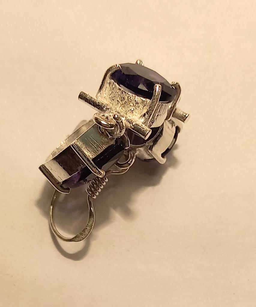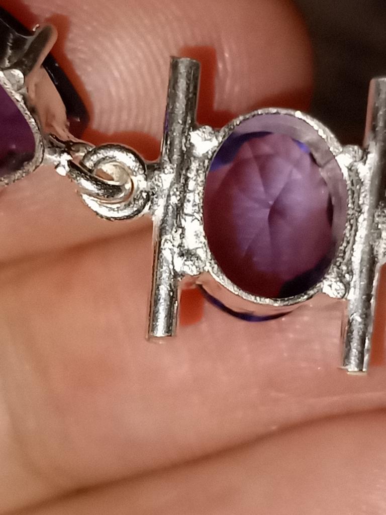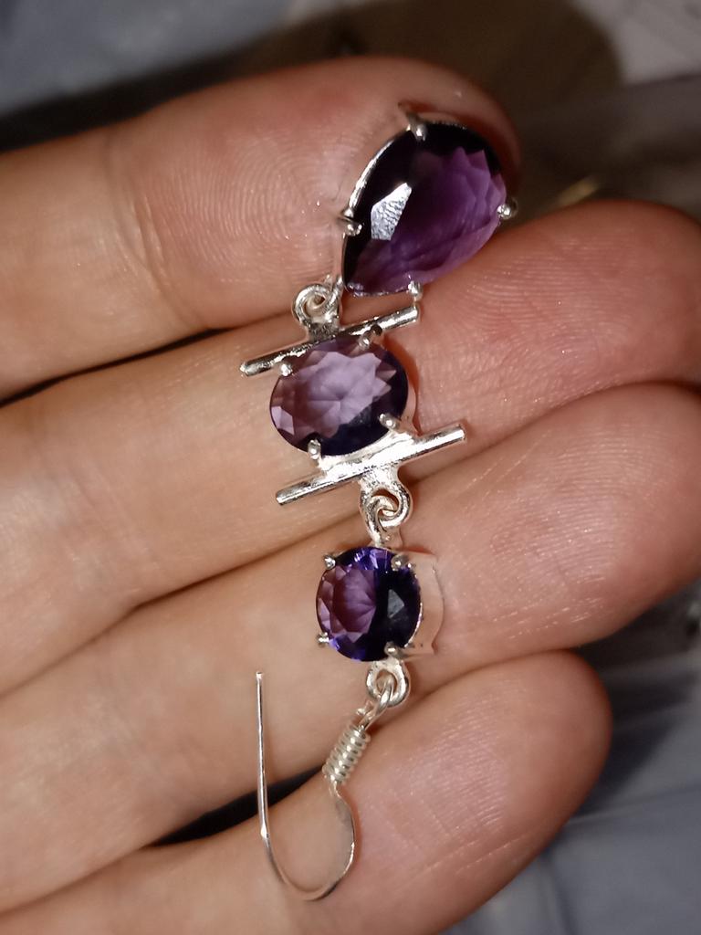 Посылка в Санкт-Петербург шла 39 дней. Серьги красивые, насыщенный цвет аметиста, немного с коричневым отсветом, похож на иолит. Правда, оправа центрального камня у одной серьги с браком (см. фото). Вместо пробы стоит какой-то штамп, что там, даже под лупой рассмотреть не удалось, но что это серебро нет сомнения.