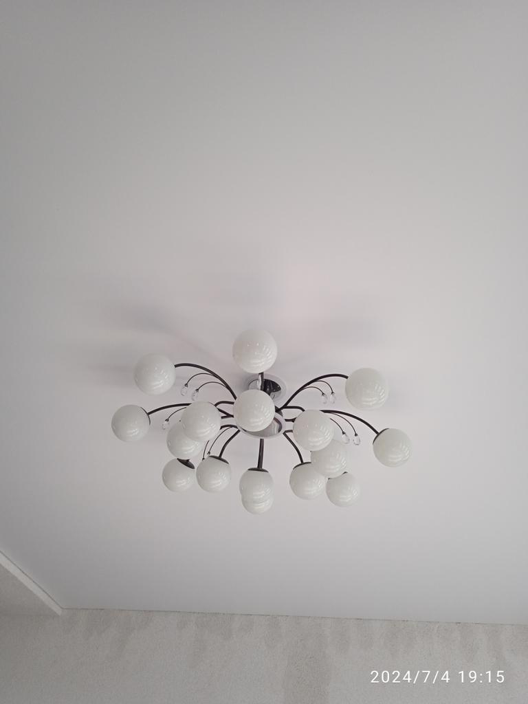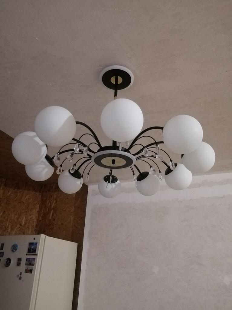Люстра хорошая, красивая. Звезду сняла за небольшие дефекты : один белый плафон немного деформирован, на других небольшие белые точки, которые видны при сборке, а когда висит на потолке не видно. Подвески пластиковые, я рассчитывала, что они будут, стеклянные, так как в описании люстры были указаны материалы стекло и металл. Совсем нет никакой инструкции ни по сборке, ни по подключению. А так же нет пульта управления, а у люстры три режима свечения, приходится переключать выключателем.