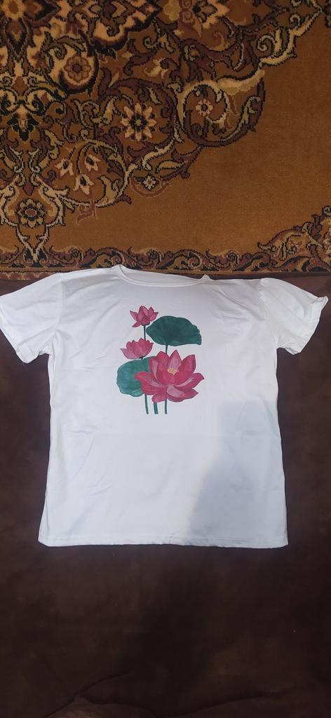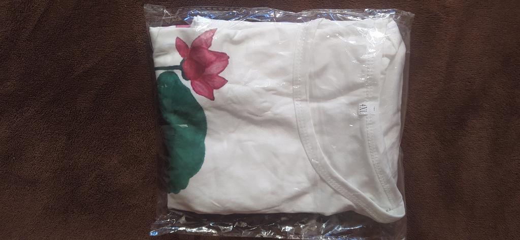 Женская футболка. Это мой выигрыш за 10 копеек. Рисунок на футболке не такой яркий, как на фото продавца, а гораздо темнее. (Поместила рядом два фото для сравнения). Никаких ярлыков о составе, способах обработки нет. Есть только ярлычок с размером 4Х. Брала на параметры 96*85*114. Продавец пишет, что в составе 70% полиэстера и 30% хлопка. На самом деле хлопком там и не пахнет. Один скользкий полиэстер, к телу, правда, приятный, не колючий. Ширина вместо 106см 104. Длина вместо 59 см 65.