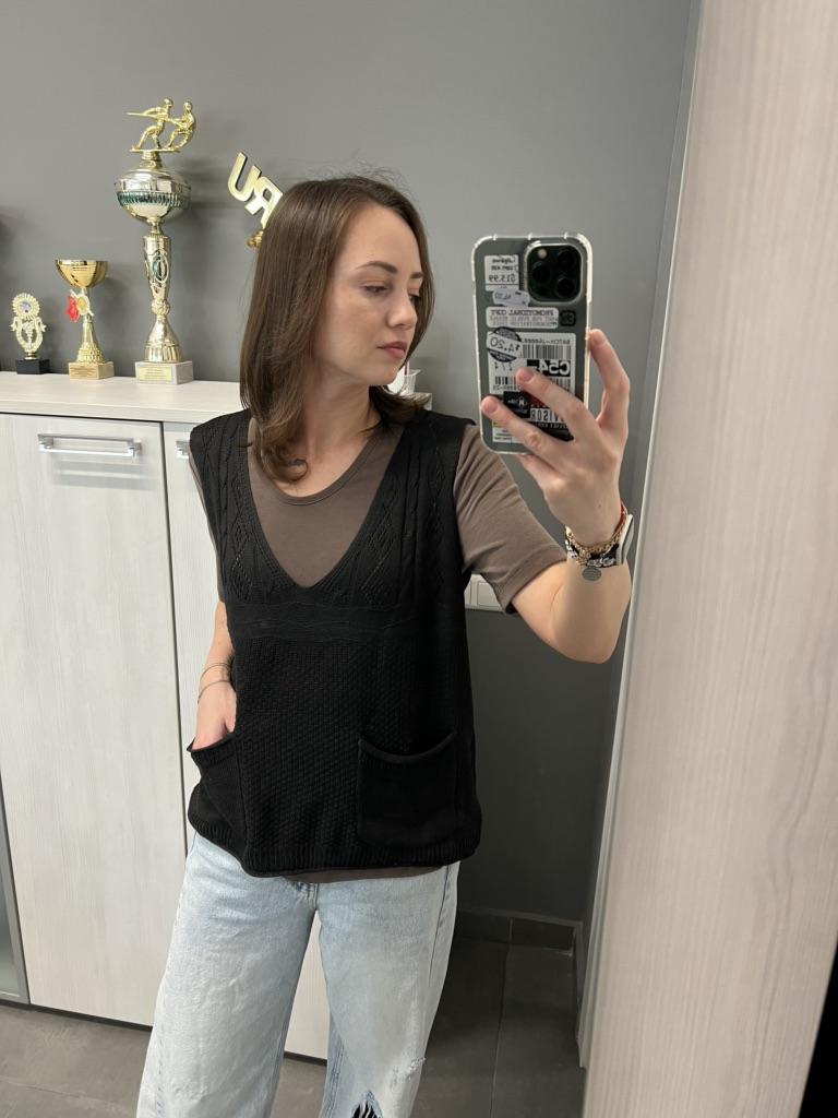 Нужно меньше размером на параметры ОГ 94, плечи 36см, вес 50кг. Очень хорошая жилетка, натуральная нить, красивая вязка, качественная.