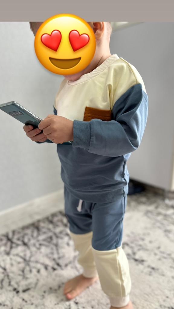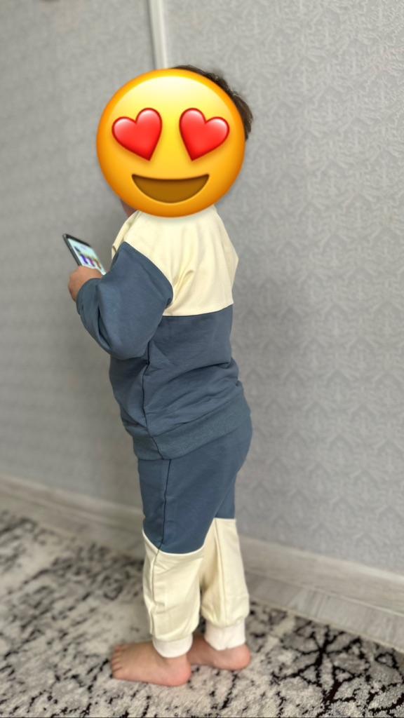 Классный костюмчик , но верхняя часть не белая , а молочного цвета . С белым сочеталось бы лучше . И очень очень маломерит . У нас 84 рост . Пришел на 90 см, но подходит на 74 . Будьте осторожны с выбором размера .