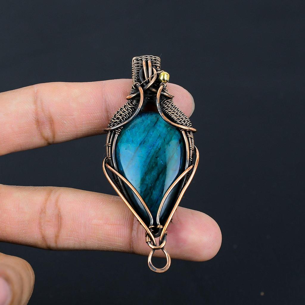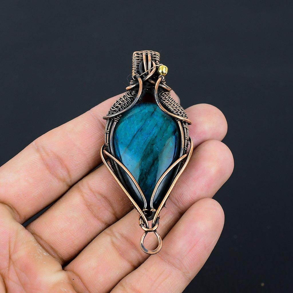 Красивый синий флэш-лабрадорит, драгоценный камень, чистая медная проволока, обернутая подвеской ручной работы, ювелирные изделия