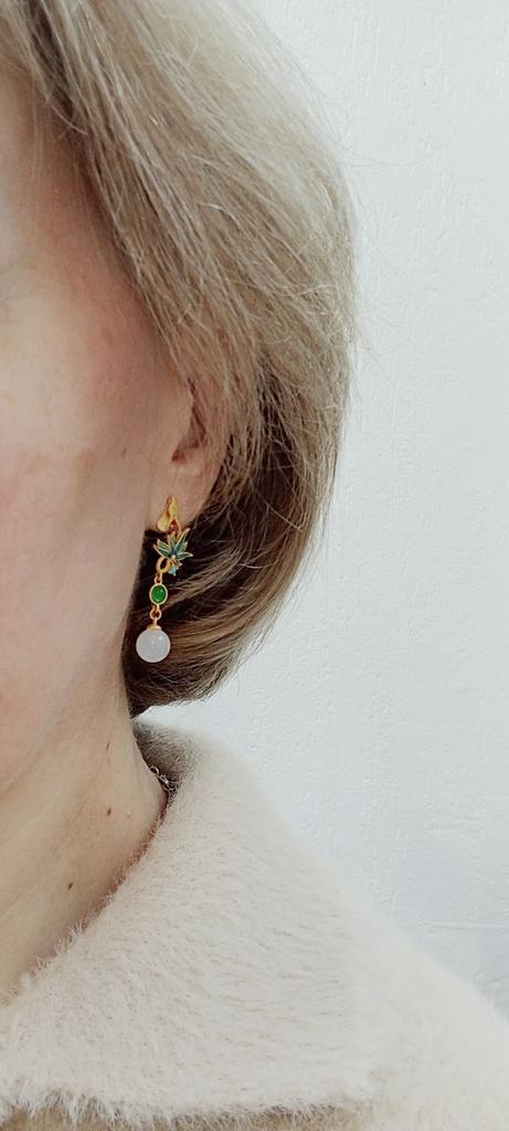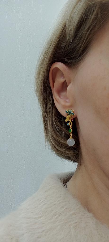 Серьги - "малышки", их размер не более фаланги пальца. Тем не менее, очень качественное исполнение нивелирует недостаток размера. Яркая, четкая эмаль "цветка", бусина под "нефрит", совокупное второе впечатление очень приятное.