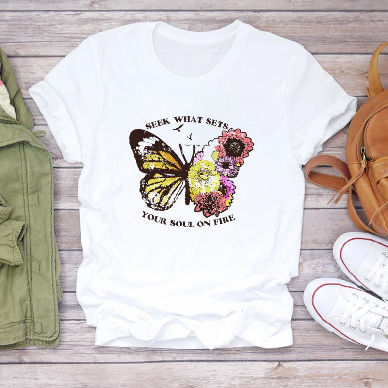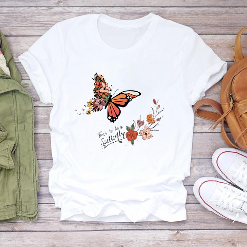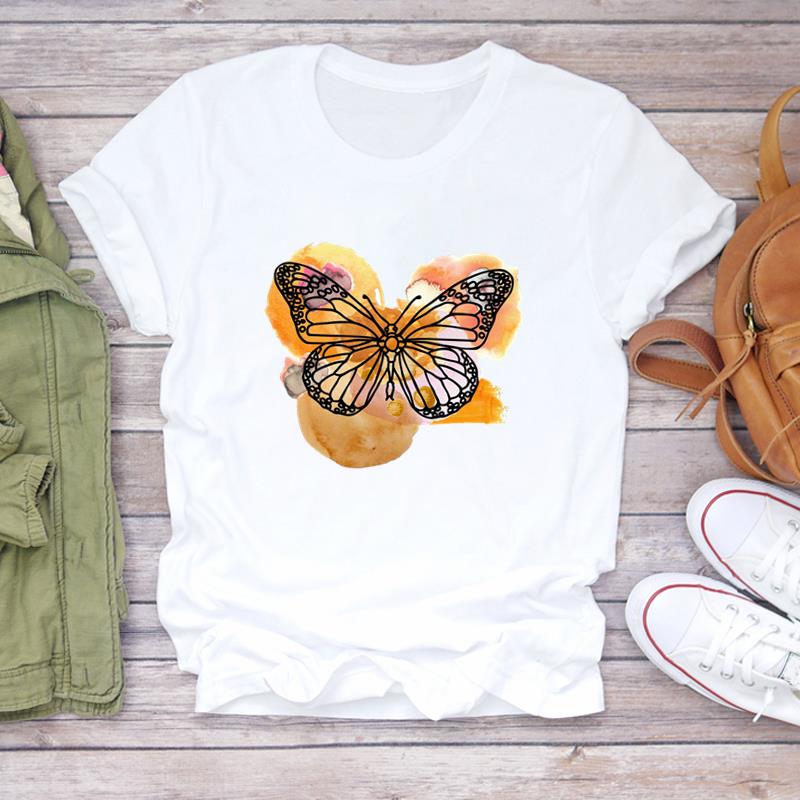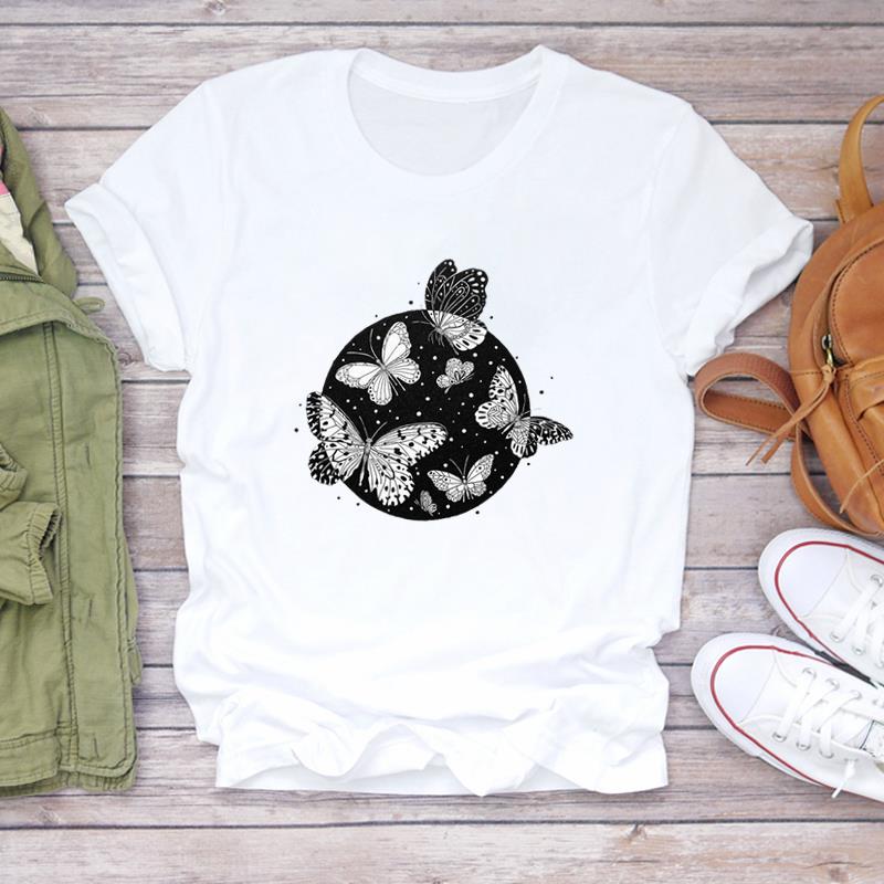 (Азиатский размер) Женская женская футболка с принтом, верхняя одежда, стильная трендовая повседневная футболка с короткими рукавами и бабочкой, женская футболка с графическим рисунком