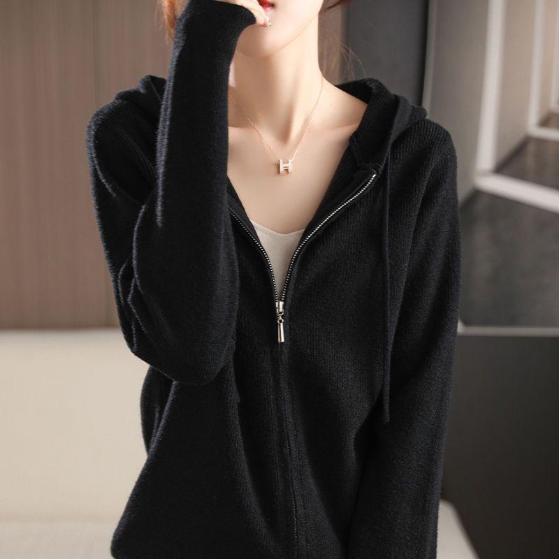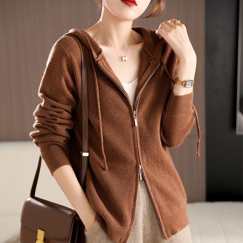 Вязаный кардиган с капюшоном, женский осенне-зимний свободный однотонный свитер с двойной молнией, корейский однотонный топ с длинными рукавами, кардиган, свитер