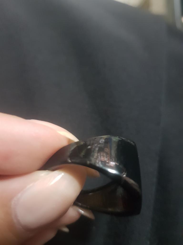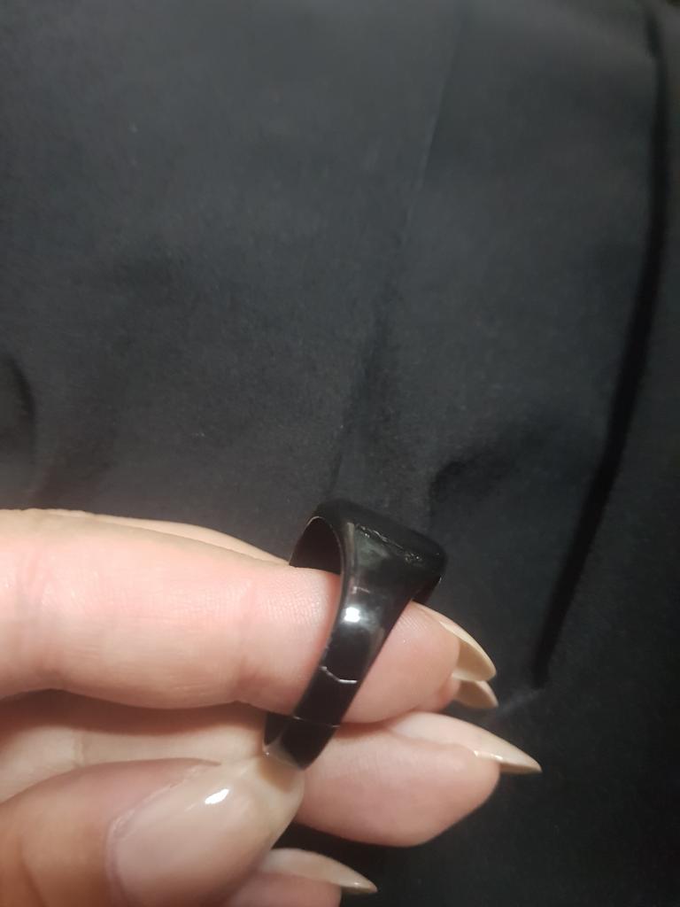 Колечко очень понравилось. Всё целое не поцарапано, не потёрто. Размер заказывала 8 (у меня 17,5 - 18). Подошло на безымянный палец.