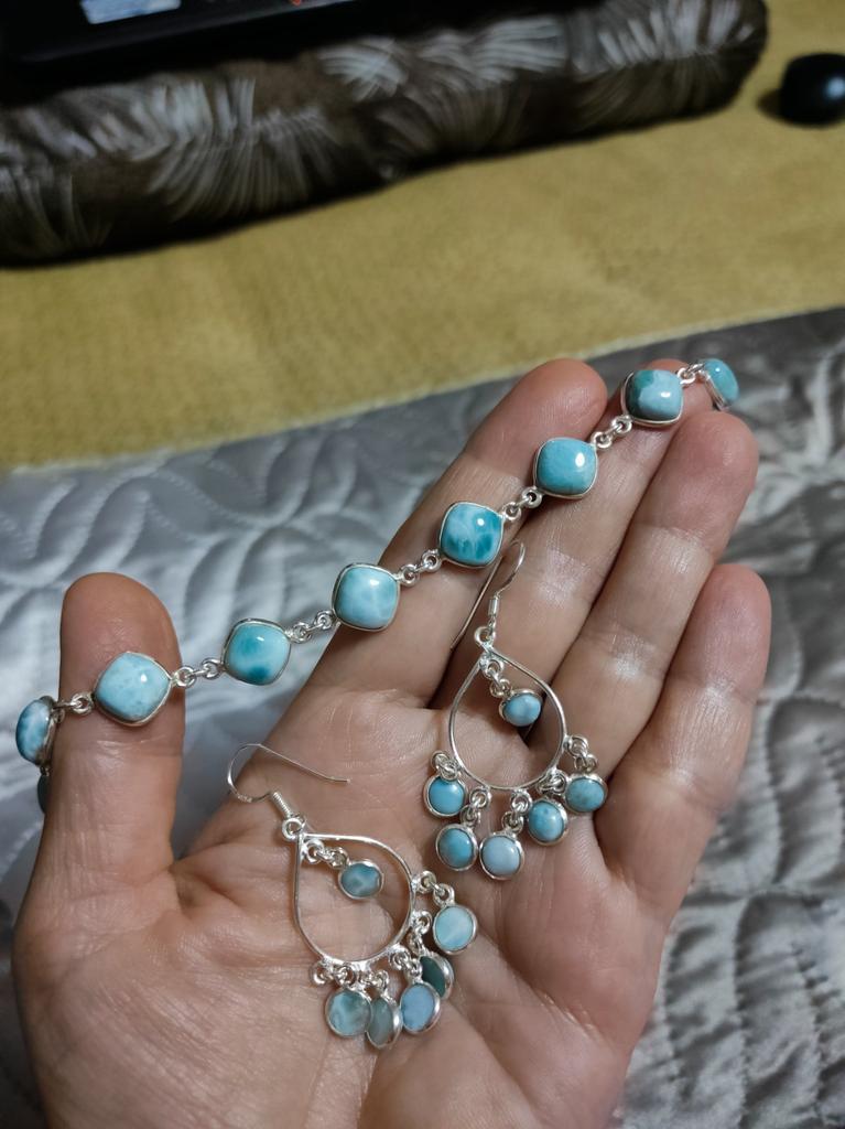 Браслет шикарный, камень натуральный, точно такой же привозили с Доминиканы. Камень завораживает своей нежностью. Доставка быстрая, объединили с такими же серьгами из ларимара, кстати серьги тоже аккуратные и нежные.
