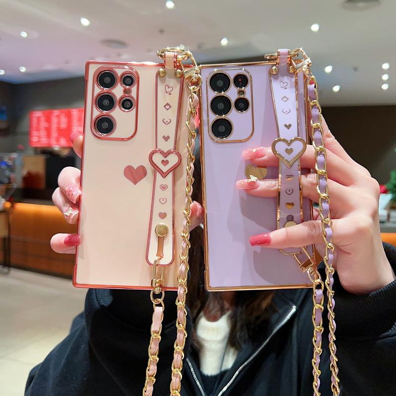 Чехол для Samsung Galaxy S23 S22 S21 Ultra S20 S21FE A14 A54 A13 A53 A23 A52, гальваническая цепочка через плечо, ремешок Love, силиконовый мягкий чехол