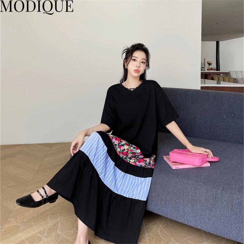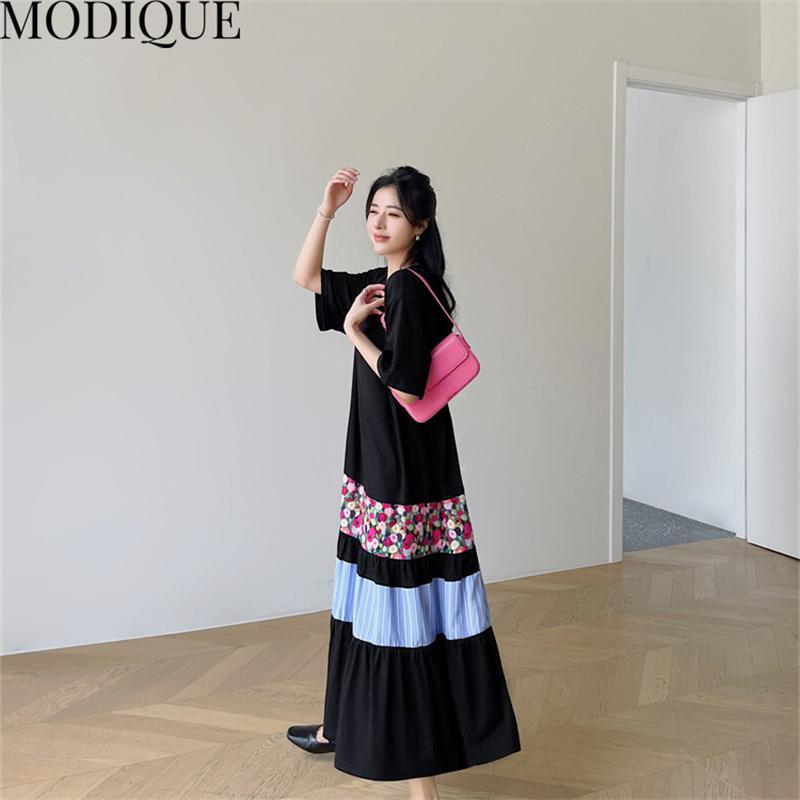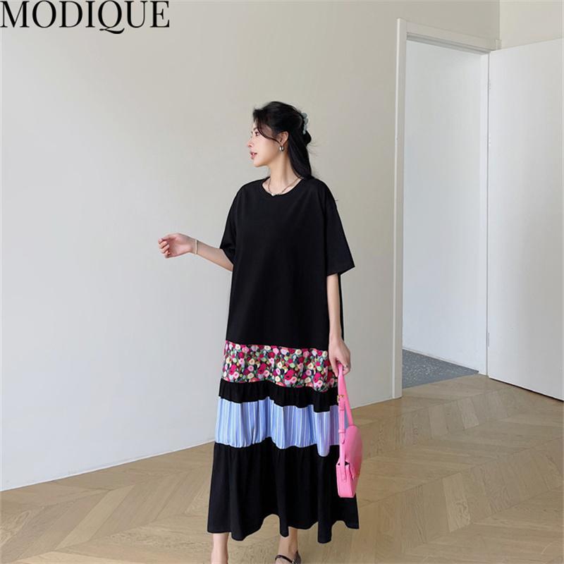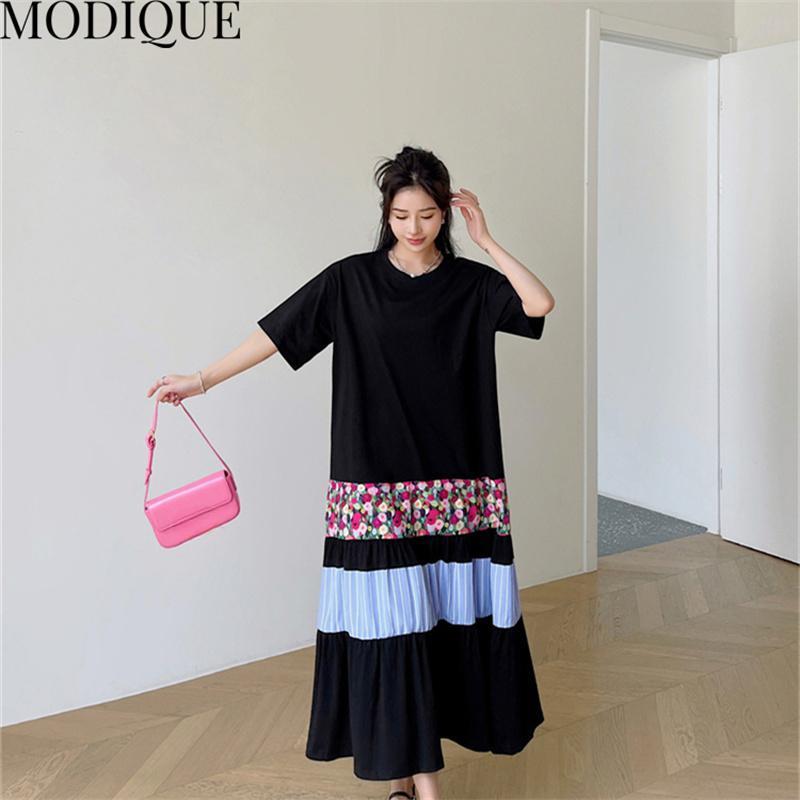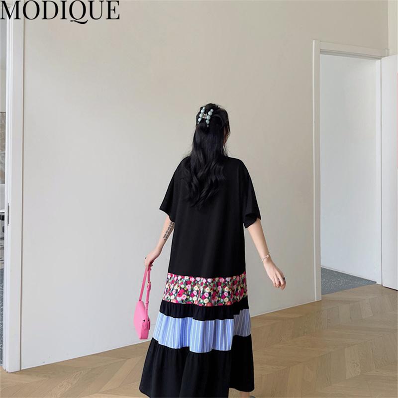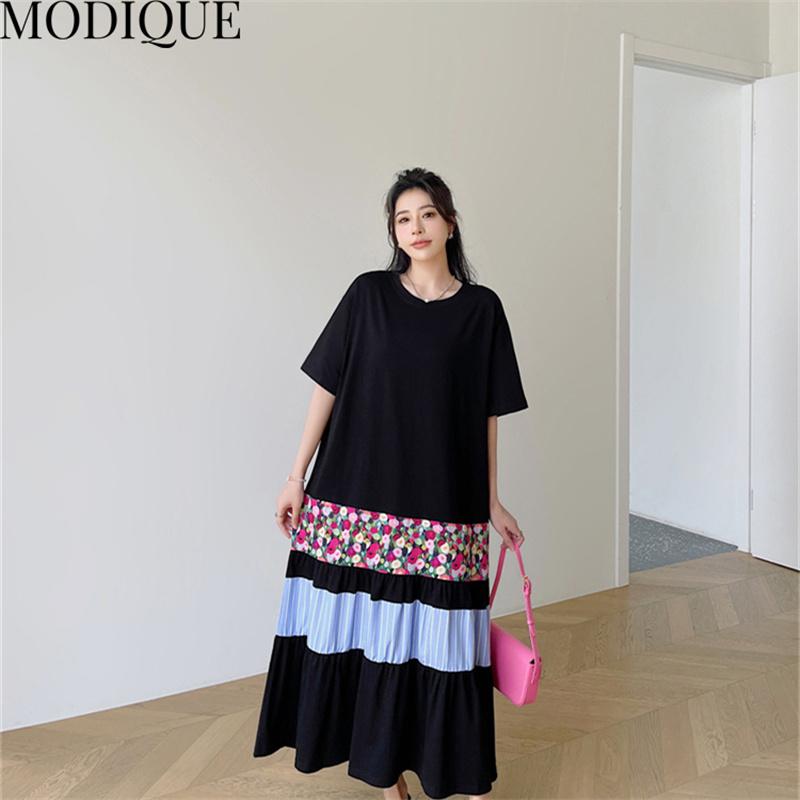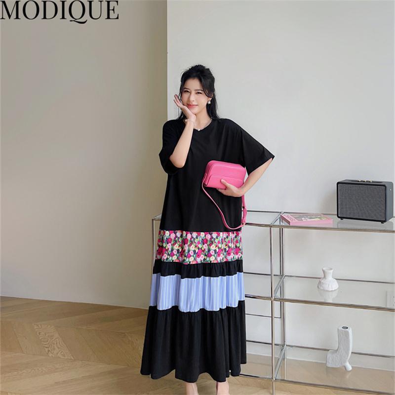 MODIQUE Лето Большие размеры Новые женские свободные лоскутные длинные плиссированные платья трапециевидной формы с принтом Элегантная женская повседневная хлопковая юбка с круглым вырезом и короткими рукавами