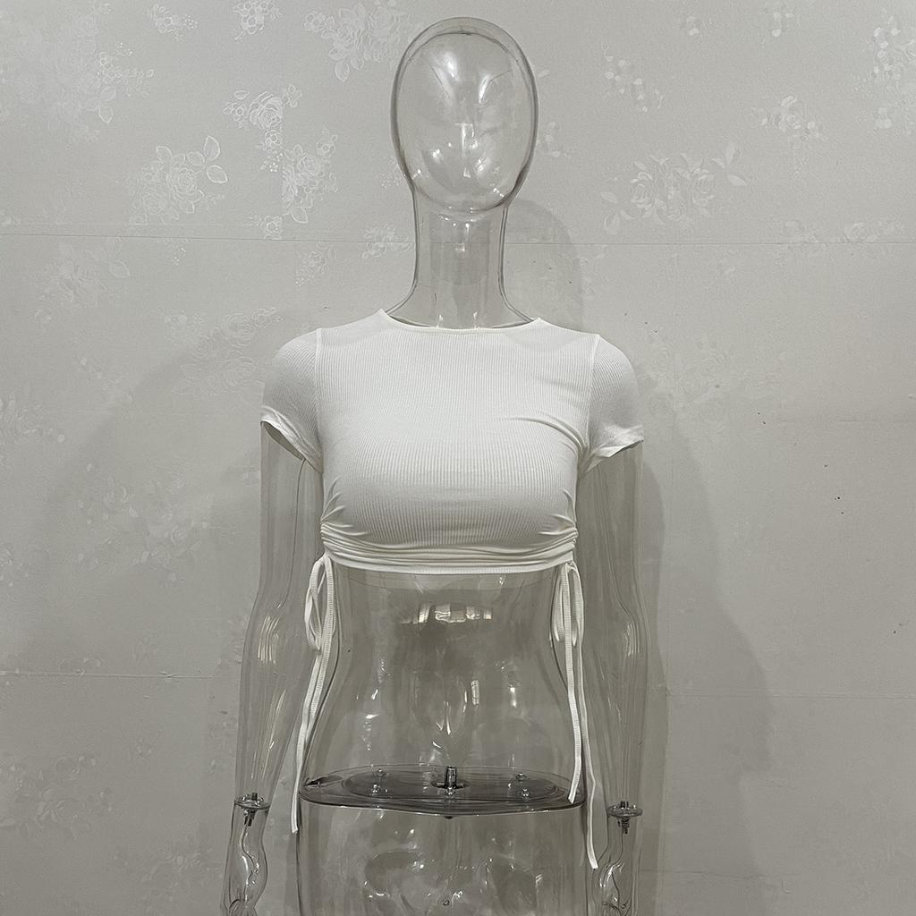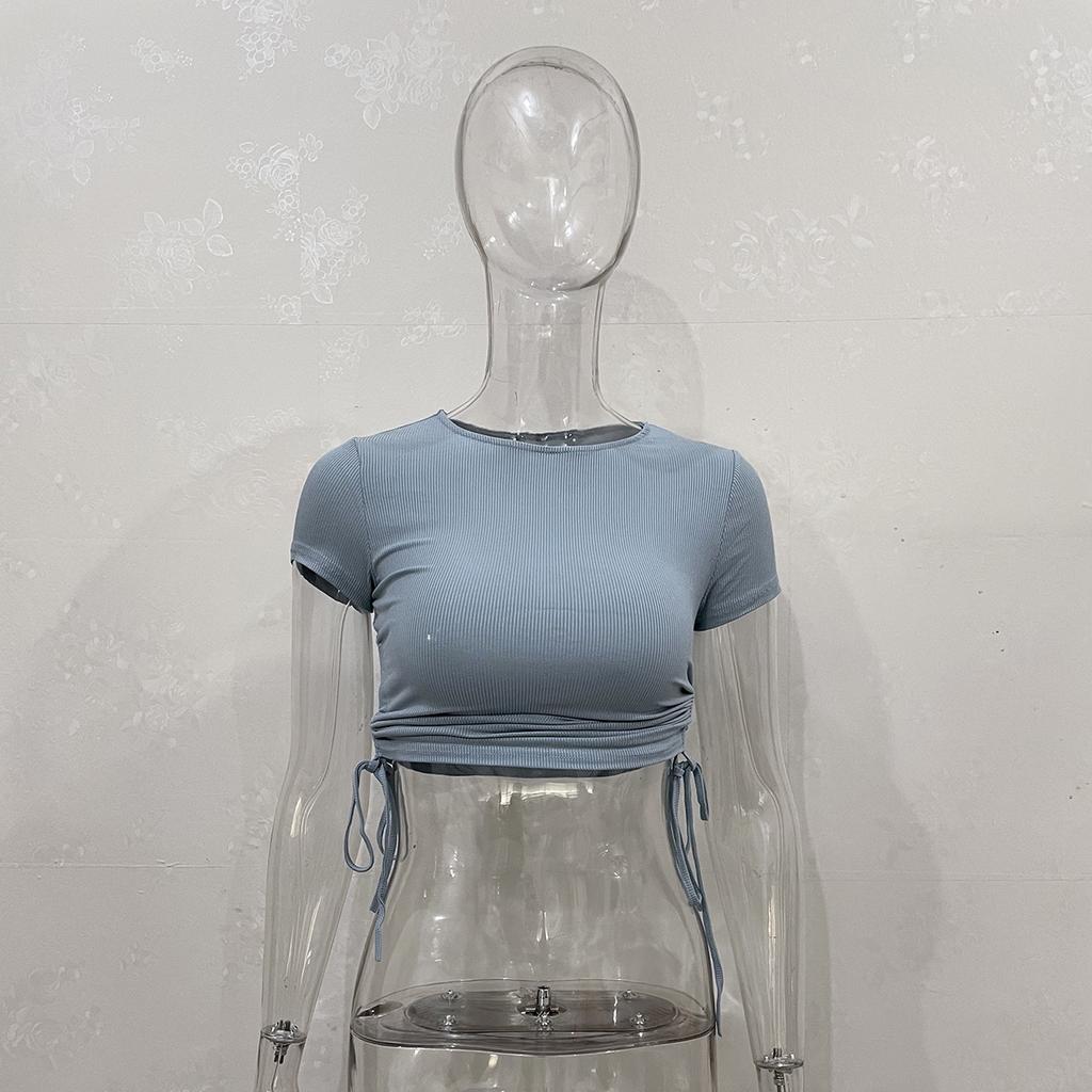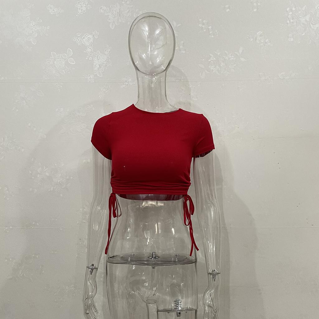 Летняя мода, сексуальный укороченный пупок, завязка на шнурке, футболка с круглым вырезом и коротким рукавом, женский топ