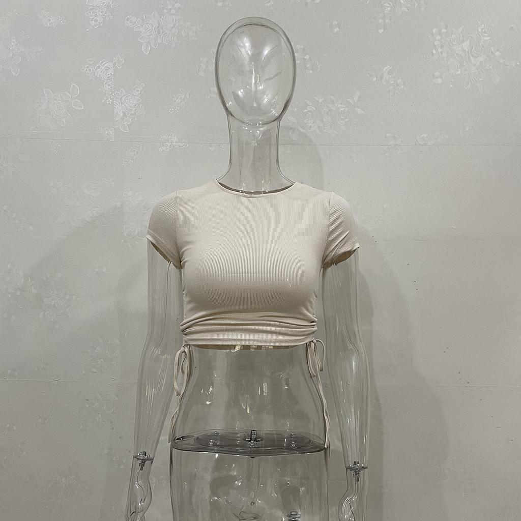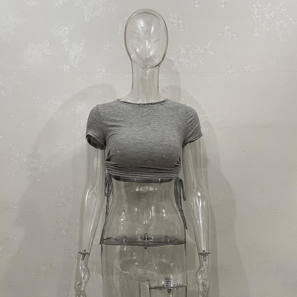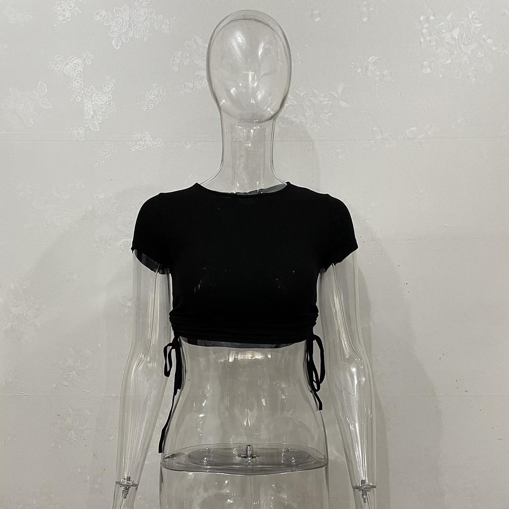 Летняя мода, сексуальный укороченный пупок, завязка на шнурке, футболка с круглым вырезом и коротким рукавом, женский топ