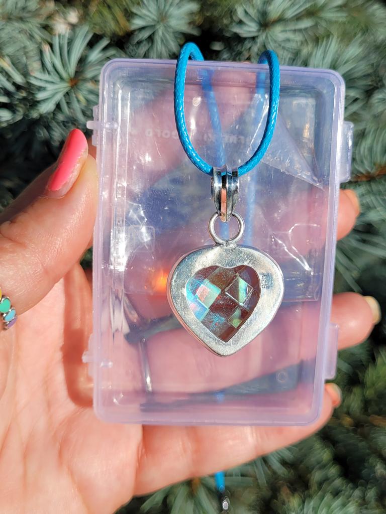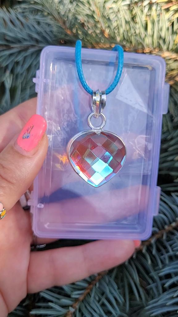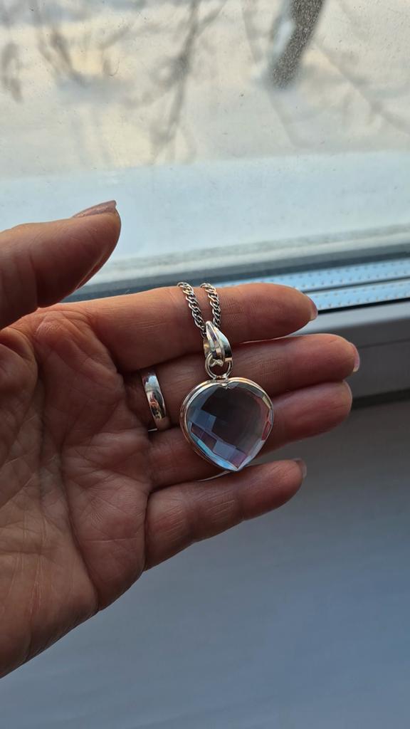 Кто любит заметную , яркую бижутерию - это для вас! Замечательный, крупный(2,5×2,5 см ) кулон с " мистическим " топазом невероятной красоты в виде сердечка. Камень необычный...вроде бы прозрачный, но блики и голубые, и коралловые... Тяжелый. Вес чувствуется. Поэтому и цепочку нужно будет соответственной толщины. У меня такая как раз имеется- из серебра. На кулоне стоит проба- 925. Всё выполнено очень аккуратно, камень закреплён крепко.
