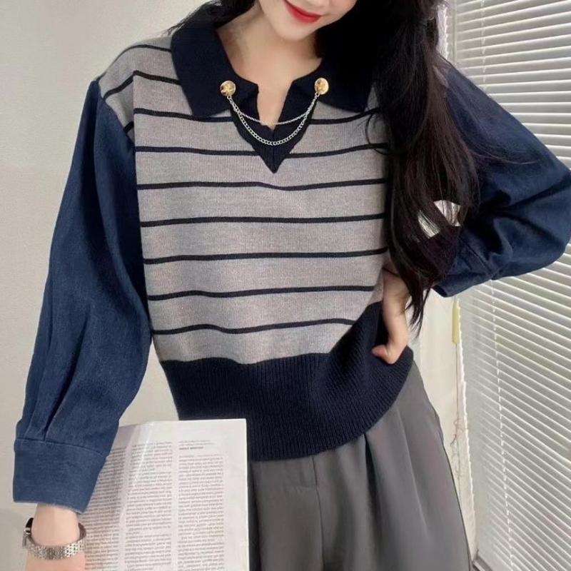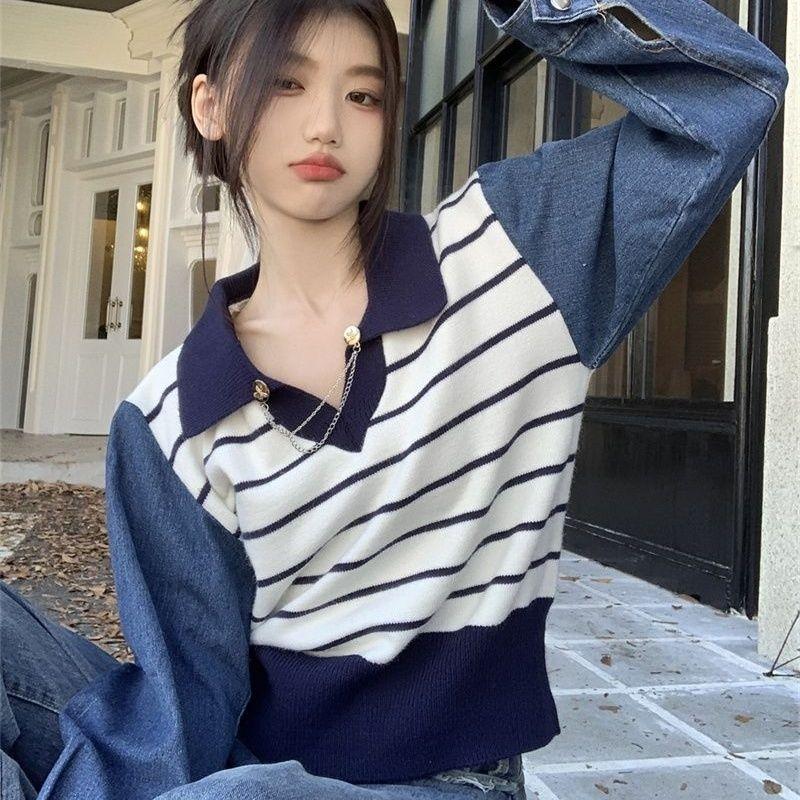 Джинсовый вязаный свитер с воротником-поло в стиле пэчворк, женский пуловер на осень/зиму 2023, дизайн, ниша, свитер в контрастную полоску, женский топ