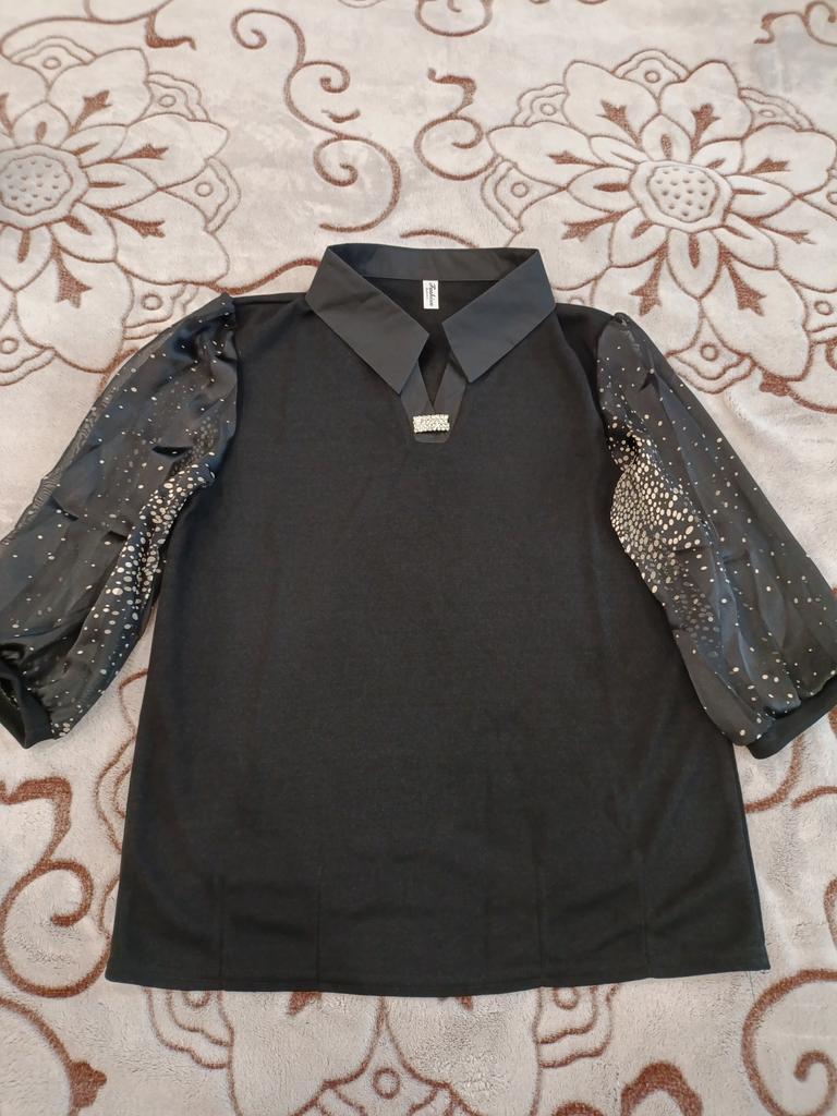 Сразу ставлю 5 звезд, на 52-54 как раз. Пошив идеальный, нитки не торчат, все ровненько. Ткань плотная, не просвечивает ,рукава похоже на шифон.Вобщем классная блузка.Советую и спасибо продавцу за качественный товар.
