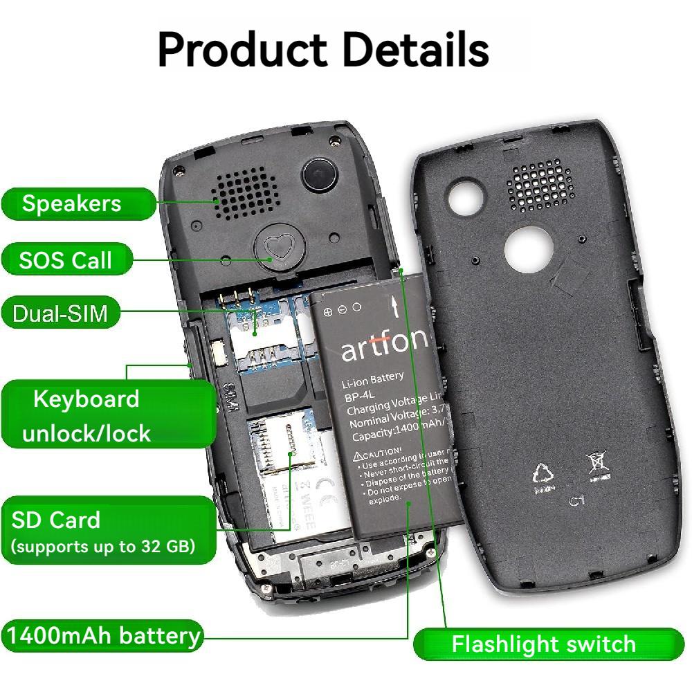 Мобильные телефоны artfone C1+ для пожилых людей с большими кнопками, большой передней панелью, кнопкой SOS и двумя SIM-картами