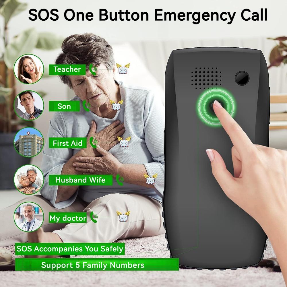 Когда возникает чрезвычайная ситуация и требуется помощь, нажмите и удерживайте кнопку SOS в течение 3 секунд, и старший телефон издаст громкую мелодию звонка, автоматически вызовет предопределенные 5 телефонных номеров SOS один за другим, пока кто-то не ответит, и отправьте SMS всем получателям одновременно по списку.