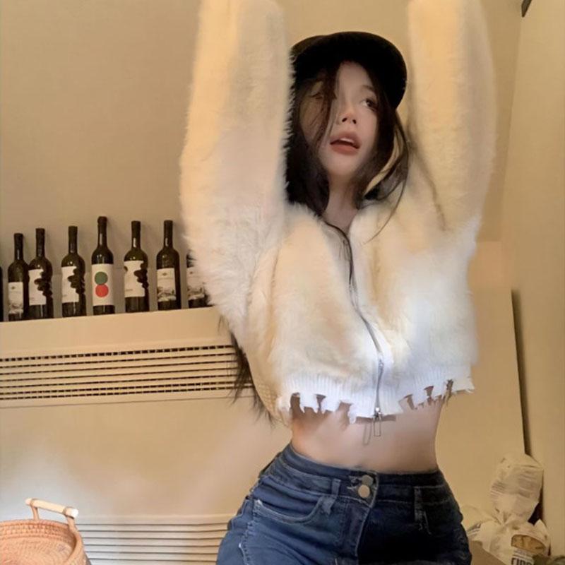 Однотонный прямой плюшевый вязаный кардиган с капюшоном, свитер, пальто, женский осенне-зимний короткий свободный кардиган на молнии, женский топ — купить товар онлайн с бесплатной доставкой по всему миру!
