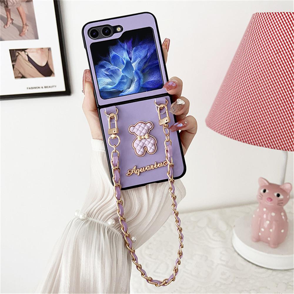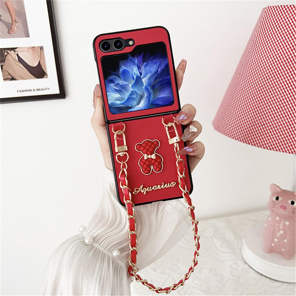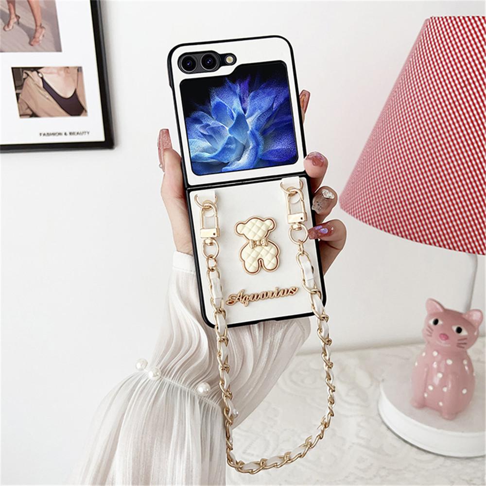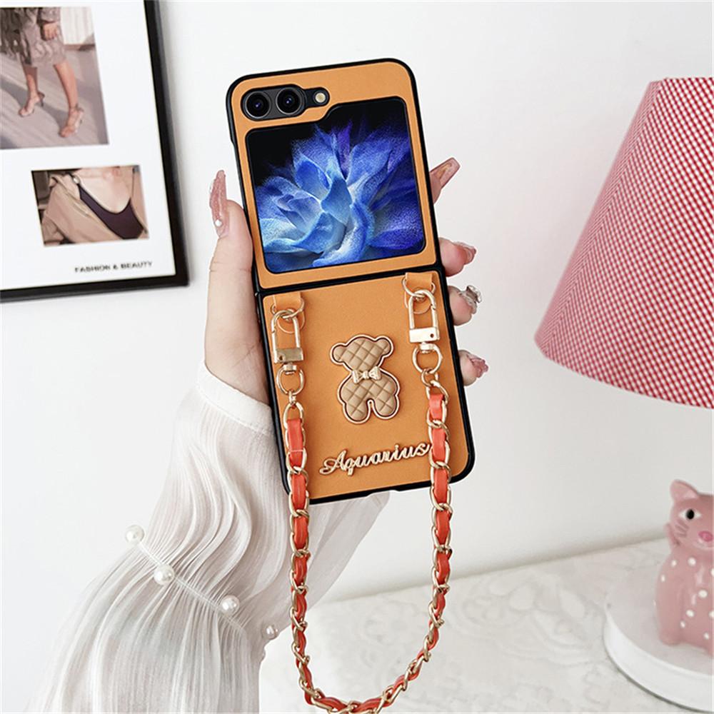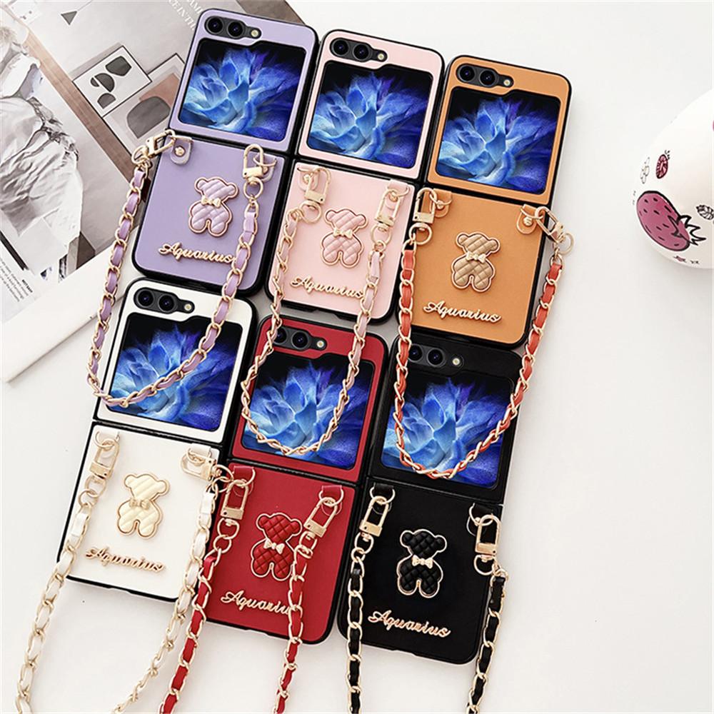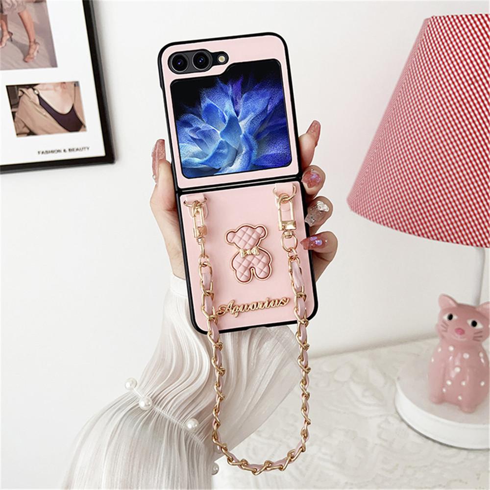 Кожаный чехол с милым металлическим медведем и жемчужной цепочкой для Samsung Galaxy Z Flip 5 3 4 Zflip3 Zflip4 Zflip5, чехол для OPPO Find N2 Flip