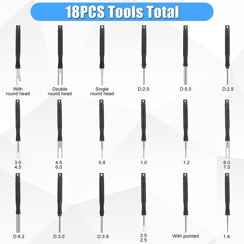 * Терминальный экстрактор изготовлен из стали и пластика толщиной 0,8 мм, высокая гибкость и долговечность, которые можно использовать повторно, не так легко потерять форму. 18 различных размеров зажимных инструментов делают работу легкой и эффективной.