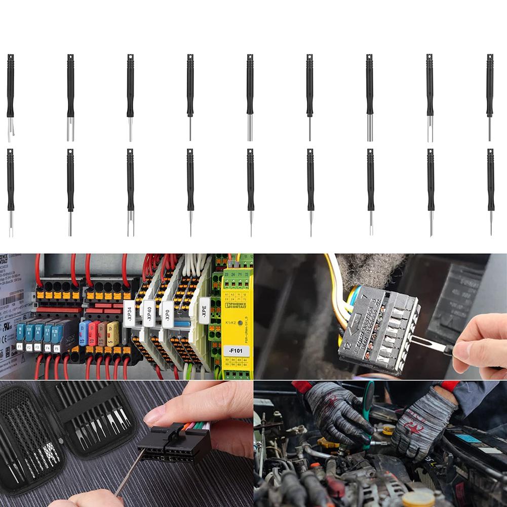 * Наш набор инструментов для удаления штифтов может широко использоваться для снятия большинства соединительных клемм, клемм жгута проводов сборщика и снятия обжимных штифтов штепсельной вилки. (такие как автомобили, жгут проводов и бытовая техника, ремонт автомобильной аудиосистемы, навигационный задний жгут проводов и т. Д.)
